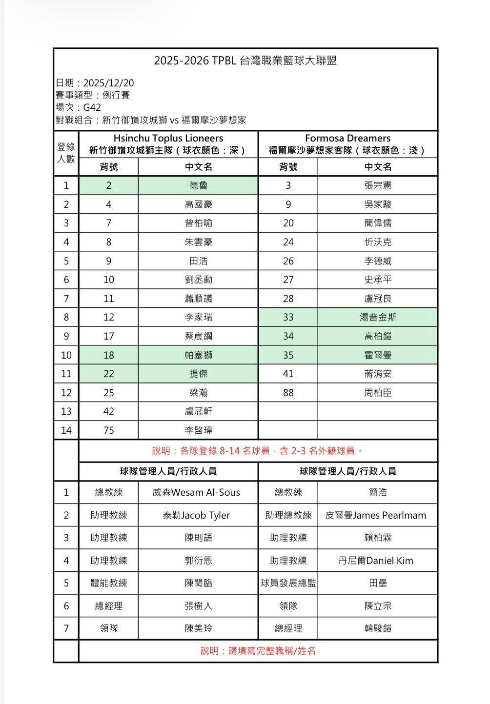 攻城獅vs夢想家登錄名單。(TPBL提供)