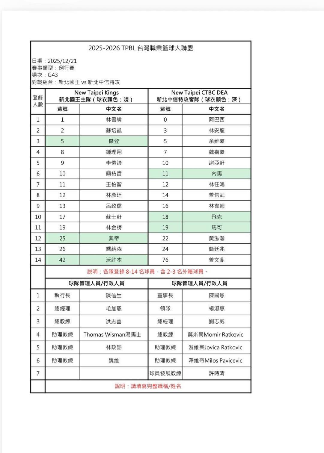 國王交手特攻雙方登錄名單。(TPBL提攻)