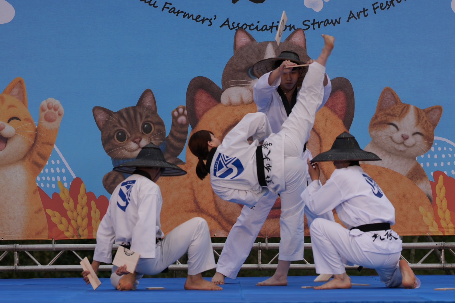 力與美的結合將現場熱度推至頂峰。結合太極、鼓藝、空手道與跆拳道,呈現全民的武術表演。太極「武動人生」剛柔並濟,而鼓藝「鼓動稻浪」讓鼓聲如雷貫耳,與遠方的山麓共鳴,象徵土地躍動的生命力。空手道社團演練「燕飛」型,表演呈現專注與爆發力;跆拳道社團則以「武稻計畫」為題,透視的踢擊與品勢,塑造青年學子的朝氣與毅力。另外,Hey boy團隊融合原民傳統元素與現代潮流表演原創曲目,以嘹亮的歌聲與曼妙舞姿,致敬花蓮多元的文化根基,現場掌聲如潮,久久不散。