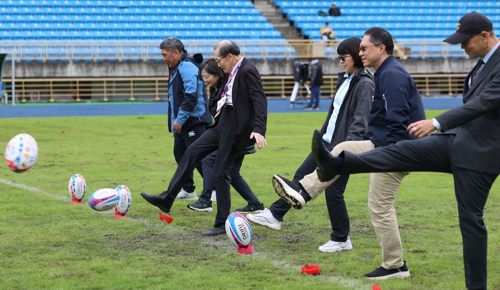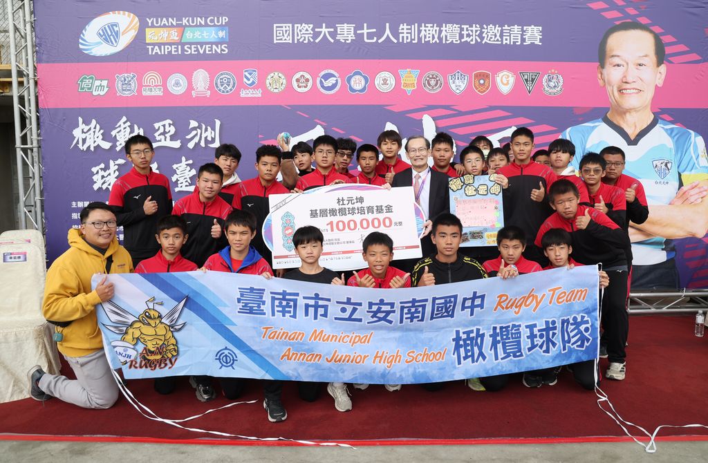 第六屆臺北元坤盃七人制國際大專橄欖球邀請賽在台北田徑場熱鬧開踢,並且捐贈基層學校10萬元,3年來已超過千萬元。(元坤運動文創產業有限公司提供)