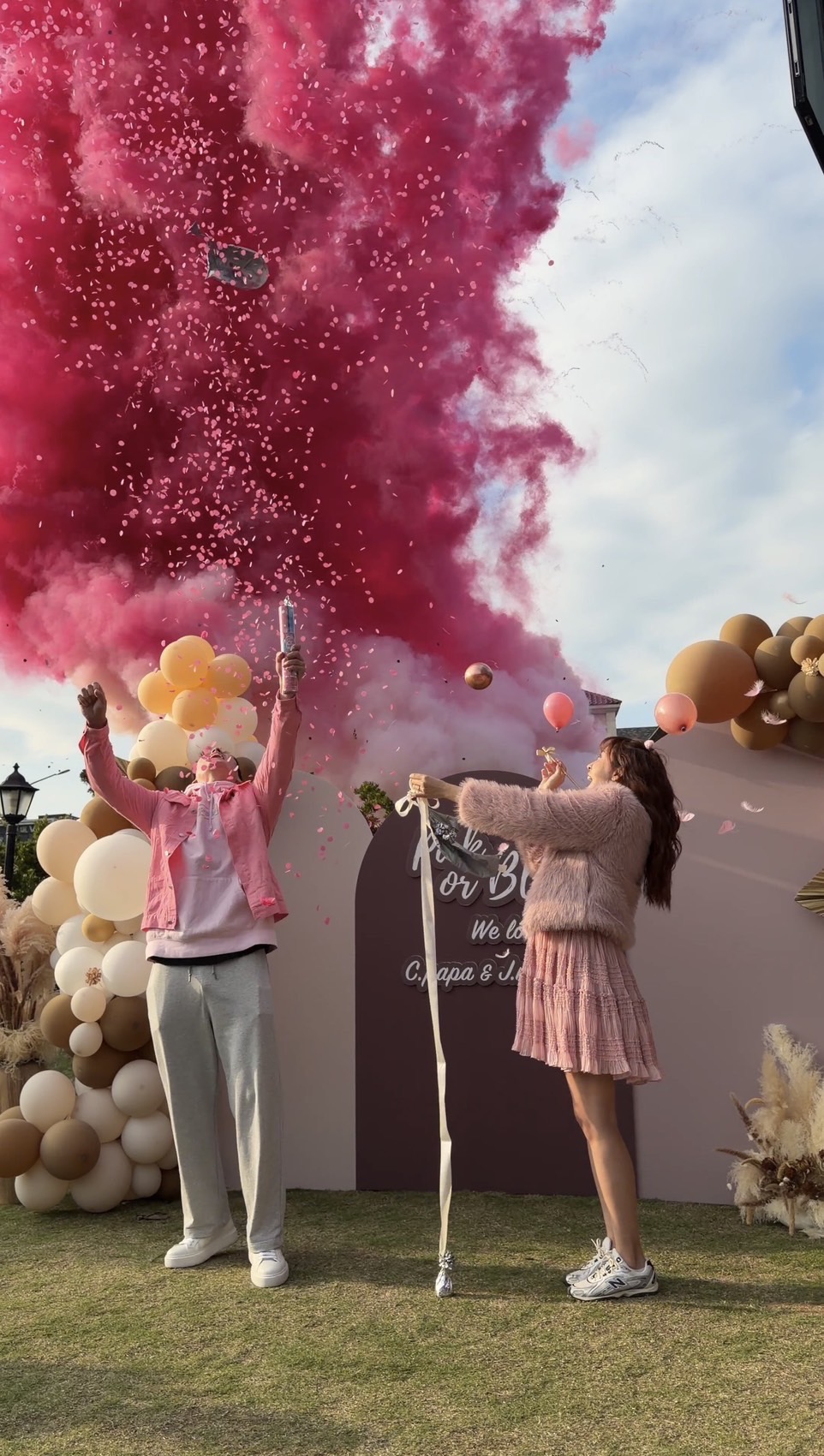 巧合的是,夫妻倆當天不約而同選擇粉紅色系穿搭,彷彿早已預感答案揭曉。陳晨威身穿粉紅外套與帽T,Julia則以粉色毛絨外套搭配百褶洋裝亮相,散發滿滿幸福感。隨著兩人戳破巨大銀色氣球,粉紅色煙霧與亮片瞬間噴發,正式宣告將迎接一位小公主誕生,現場氣氛溫馨又感動。