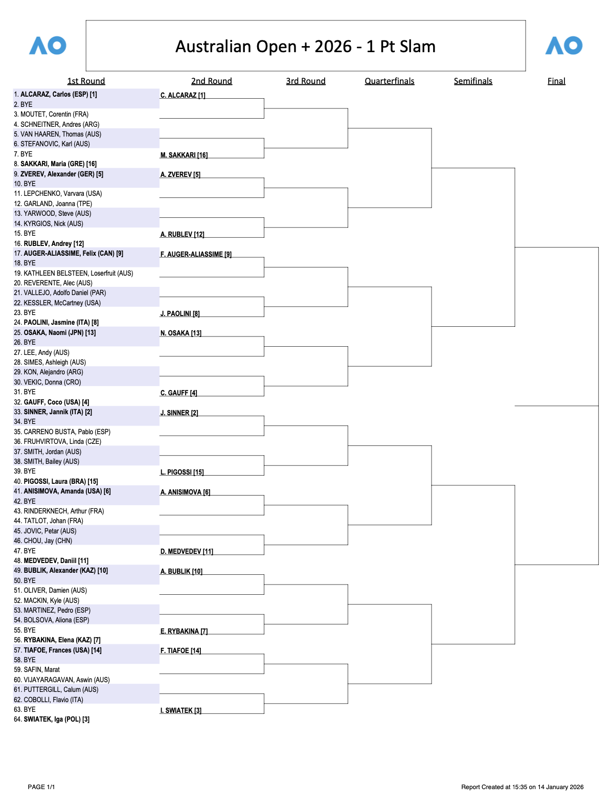 2026年澳洲網球公開賽推出新活動「1分大滿貫」,而籤表上,我國藝人周杰倫被寫代表「CHN」,引起球迷關注。我國另外參賽的「台灣一姊」葛藍喬安娜則是寫代表「TPE」。