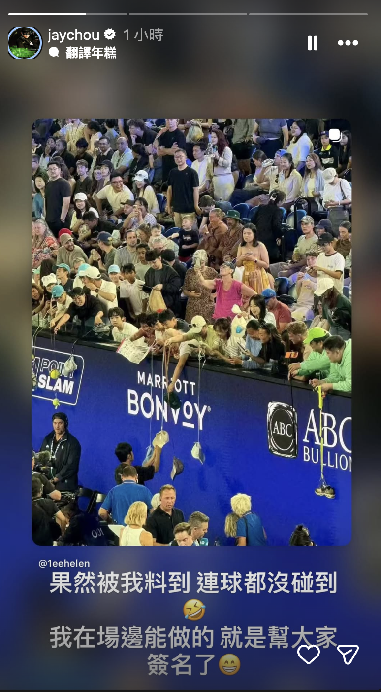 賽後,周杰倫在ig限時動態上寫道,「果然被我料到連球都沒碰到,我在場邊能做的,就是幫太家簽名了」、「以後除了練球還要練剪刀石頭布,贏的選發球」。