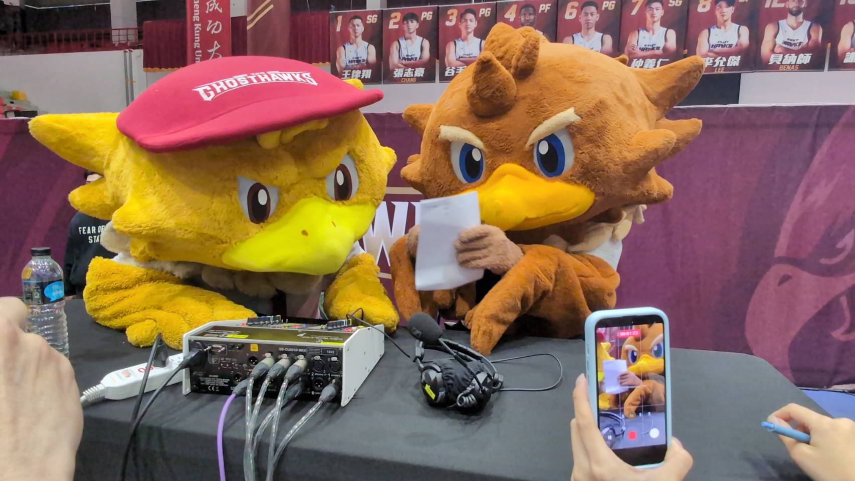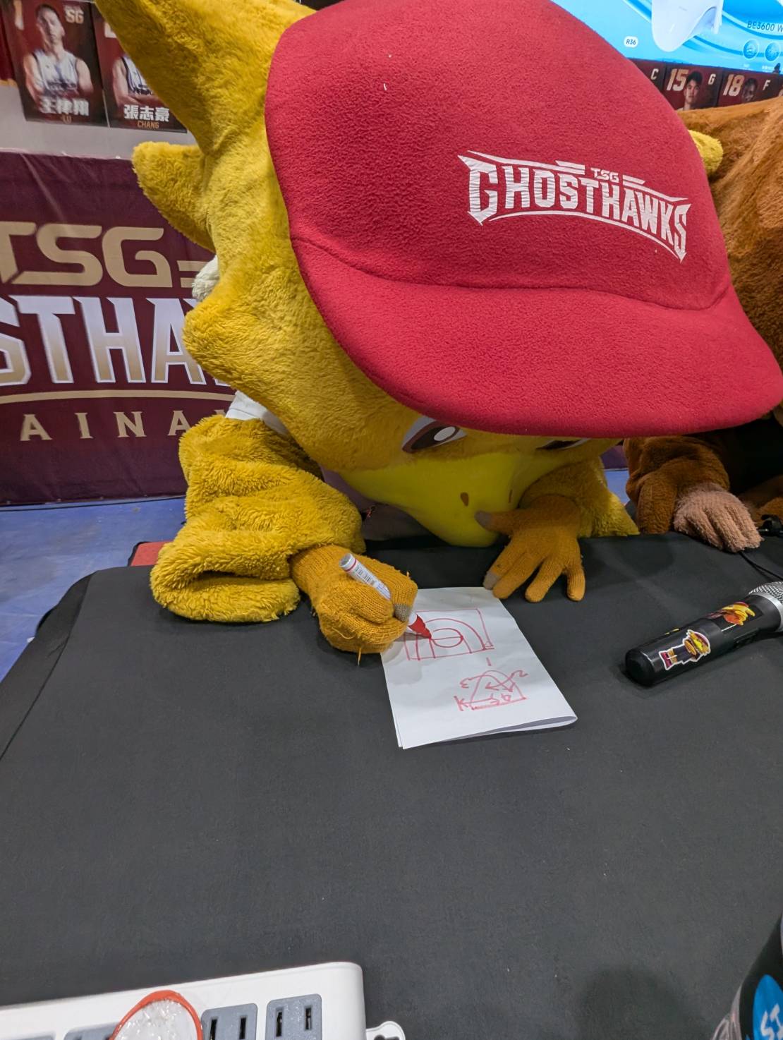 今天獵鷹在成功大學主場迎戰桃園璞園領航猿,排球隊吉祥物 SKY 特別「跨界支援」,與老大哥大員同場亮相。賽前兩隻吉祥物一時技癢,竟直接坐上主播台,不只拿起麥克風模仿播報,甚至還在桌前「畫戰術」,逗得現場球迷笑聲不斷。