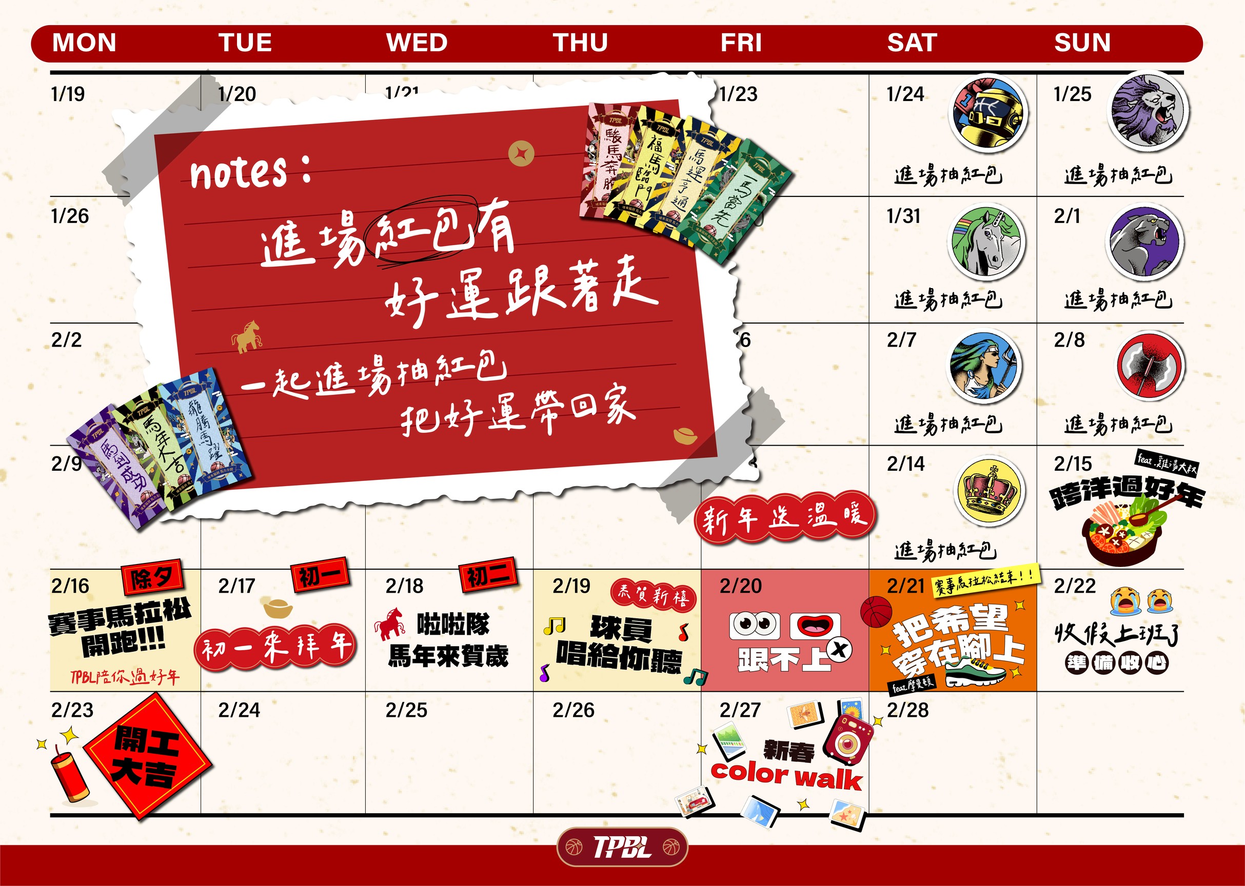 春節前夕,TPBL也準備了滿滿驚喜。凡於指定日期入場觀賽的球迷,即可獲得聯盟限定春節紅包,每場次限量 500 份,其中 150 位幸運球迷可獲得刮刮樂並抽中隨機獎品。即使未能中獎,紅包內仍包含聯盟特製球員好運籤,為球迷送上新年祝福,祝願來年好運相隨、事事順心。