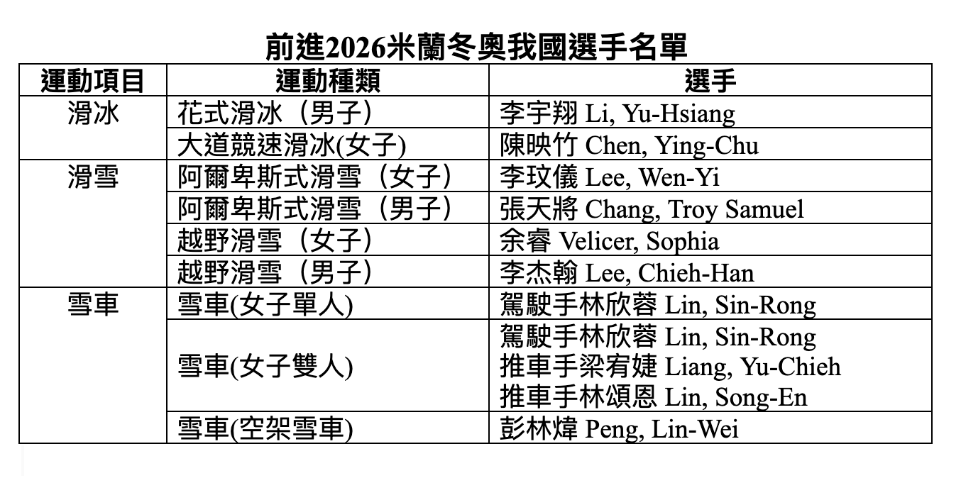 冬季奧林匹克運動會中華代表團名單。(運動部提供)