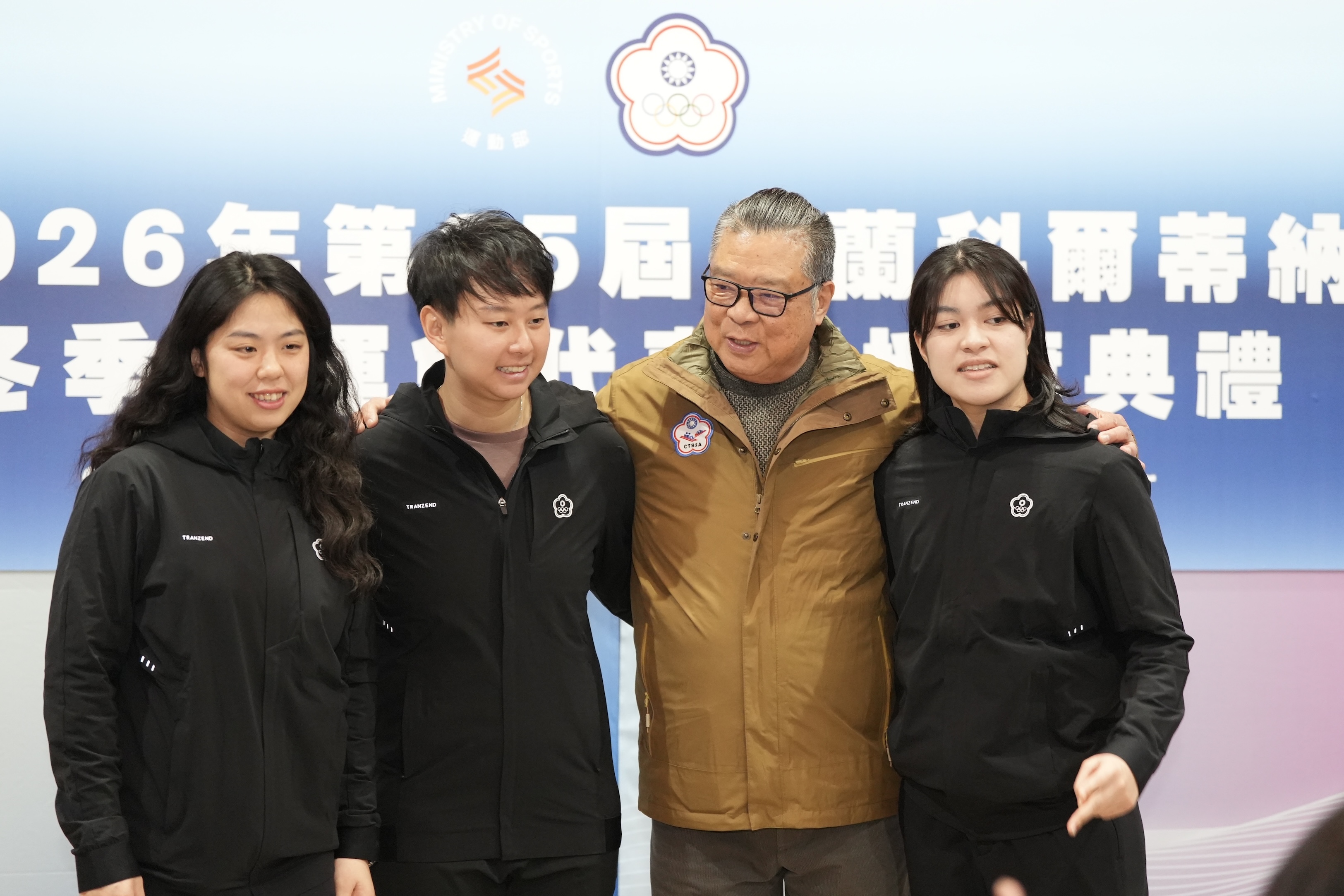 運動部和中華奧會今天舉行冬奧中華代表團授旗典禮。中華民國雪車協會秘書長宋守智(右二),和雪車選手林欣蓉(左二)、梁宥婕(左一)、林頌恩(右一)合影。(李宇政攝)