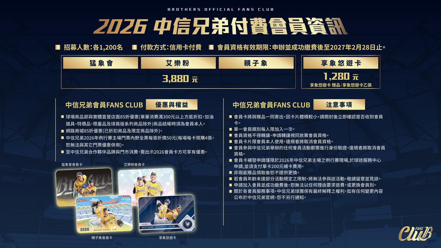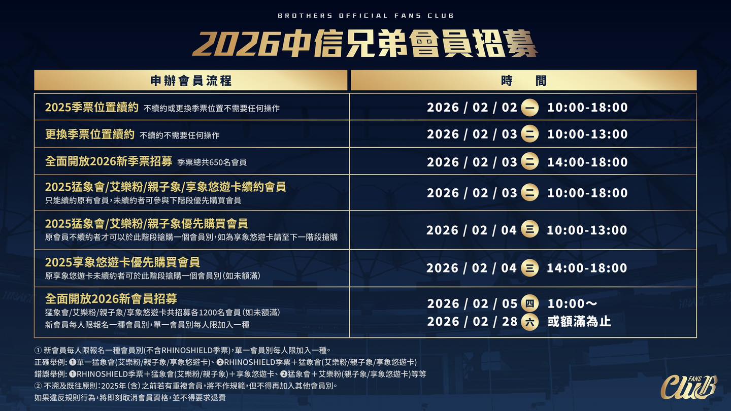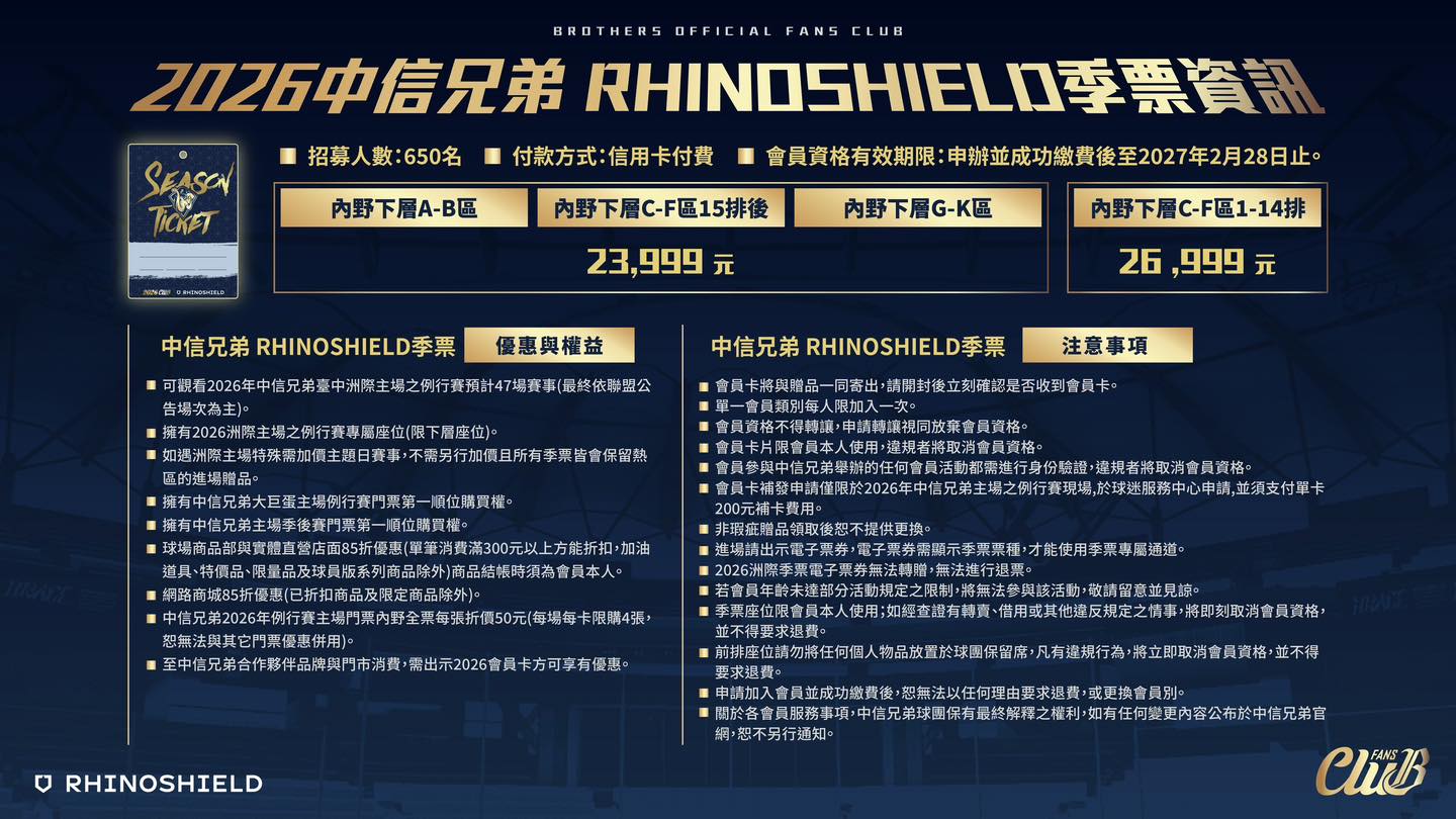 中信兄弟今天宣布2026年𝐑𝐇𝐈𝐍𝐎𝐒𝐇𝐈𝐄𝐋𝐃 季票及會員正式開賣,今年季票季票招募人數是650人、付費會員招募人數1200人,跟去年相同,不過今年2026新會員報名,不含𝐑𝐇𝐈𝐍𝐎𝐒𝐇𝐈𝐄𝐋𝐃季票,僅限報名一種會員別 ,單一會員別每人限加入一種。