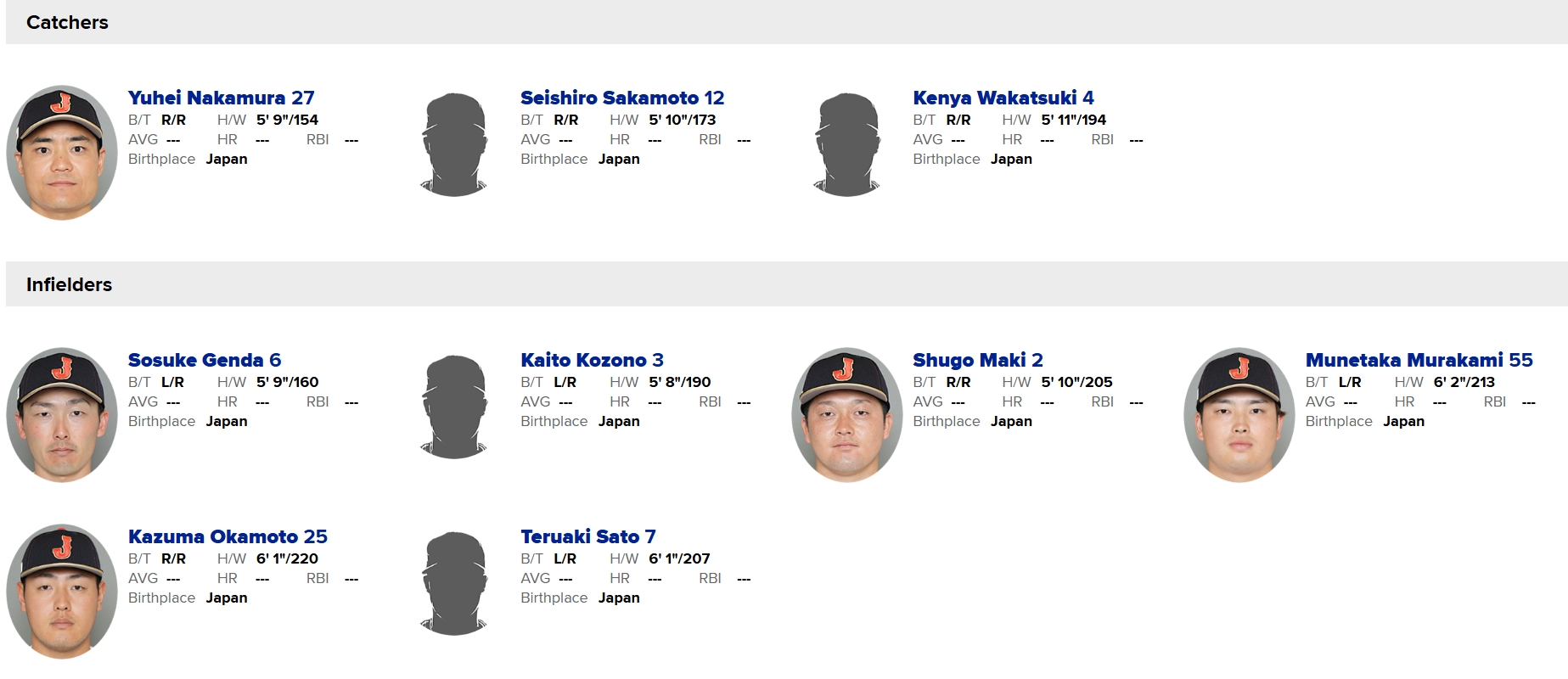 此外,雖未參賽,達比修有仍會以顧問身分隨隊,協助投手群情蒐與策略分析,提供寶貴經驗與領導力。日職球員方面,也不可忽視,有伊藤大海、佐藤輝明。