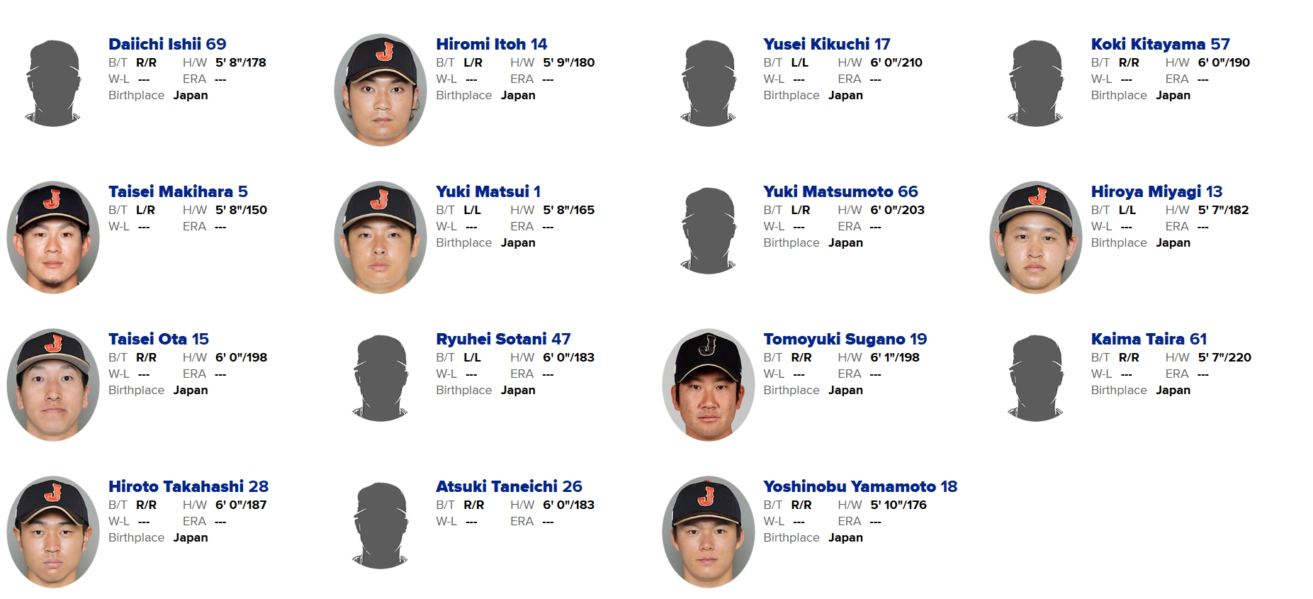 山本由伸、松井裕樹、吉田正尚。本屆新加入:菅野智之、菊池雄星、鈴木誠也、岡本和真、村上宗隆(本季挑戰MLB),合計9名大聯盟球員,創下賽史新高。
