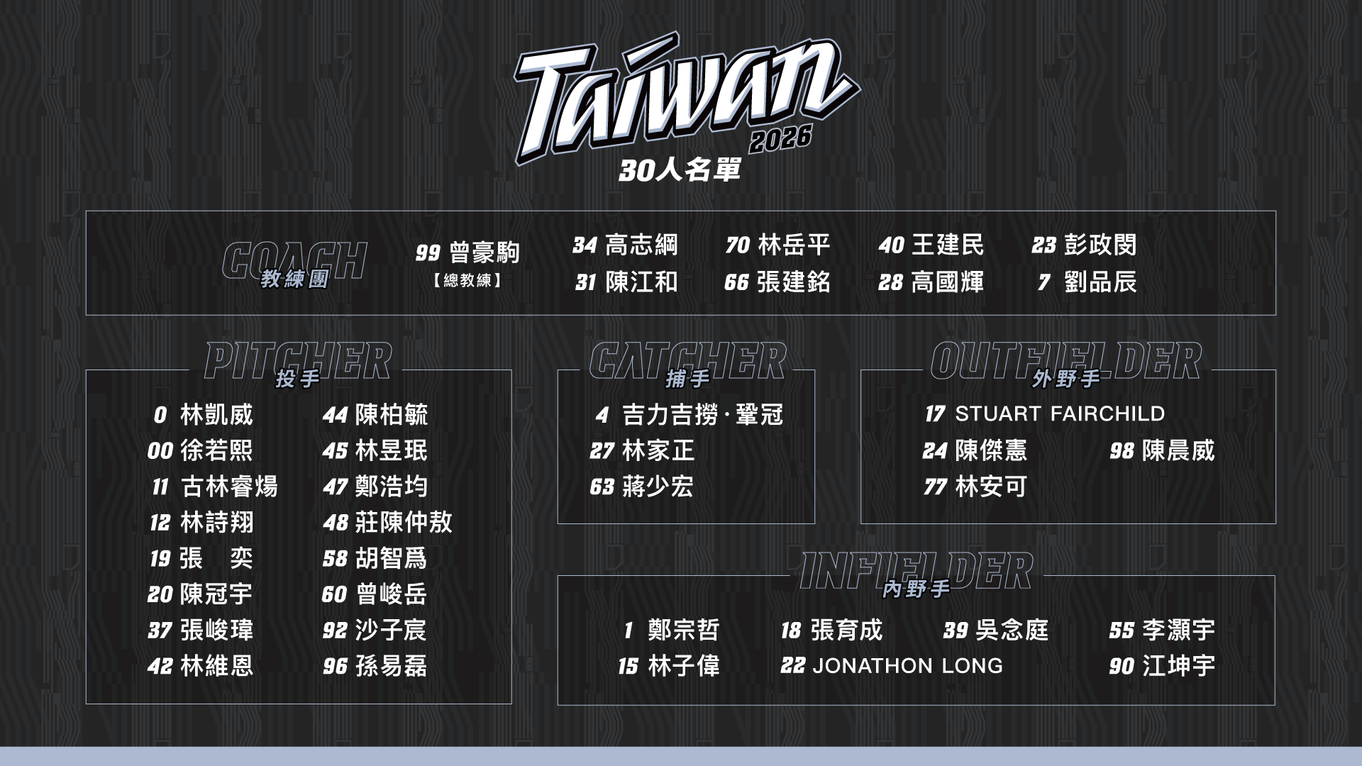 2026年世界棒球經典賽(WBC)6日公布各隊正選30人名單,中華職棒也公布入選選手背號,林凱威選擇0號,徐若熙穿00號,內野手張育成則是選擇18號。