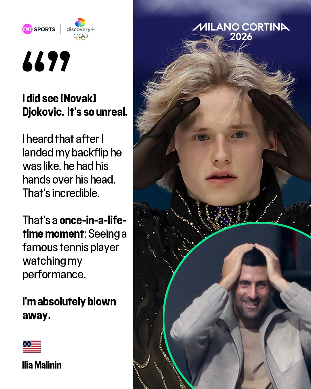 「我真的有看到Djokovic,這感覺太不真實了。」Malinin賽後表示,「我聽說在我完成後空翻落地後,他雙手抱頭,這太不可思議了。這是一生一次的時刻,看到一位如此知名的網球選手在看我的表演……我完全被震撼到了。」