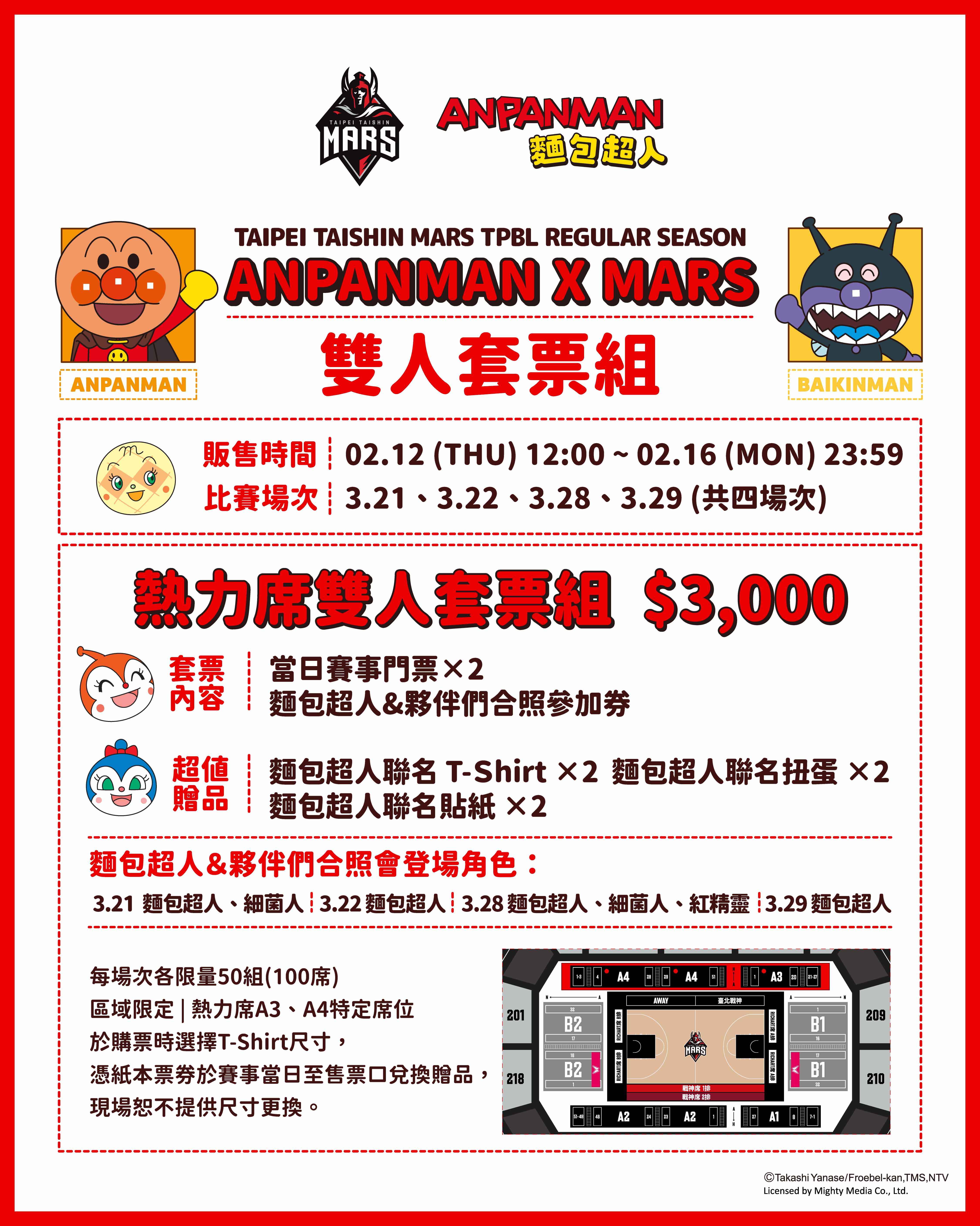 麵包超人聯名雙人套票為熱力席限定方案,售價 3,000 元,將於 2 月 12 日中午 12:00 至 2 月 16 日晚間 23:59 限時線上販售,每場次限量 50 組。套票除包含兩張門票外,亦附麵包超人與夥伴們合照參加權,球迷可與角色合影留念;其中 3 月 21 日與 28 日將有細菌人登場,3 月 28 日另加碼紅精靈一同現身,增添拍照亮點。此外,套票還包含聯名 T-shirt、扭蛋與貼紙包等專屬贈品。