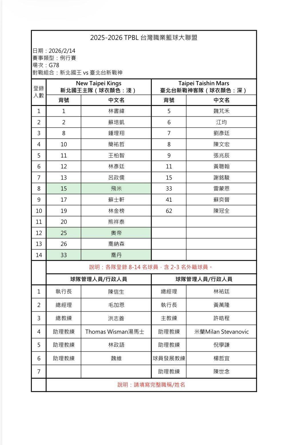 臺北台新戰神今(14)日迎來年前最後一戰,客場挑戰新北國王。賽前登錄名單出爐,戰神再度以「全本土」陣容應戰,在洋將全數掛傷的情況下,將以本土戰力正面迎戰力拚排名的國王。
