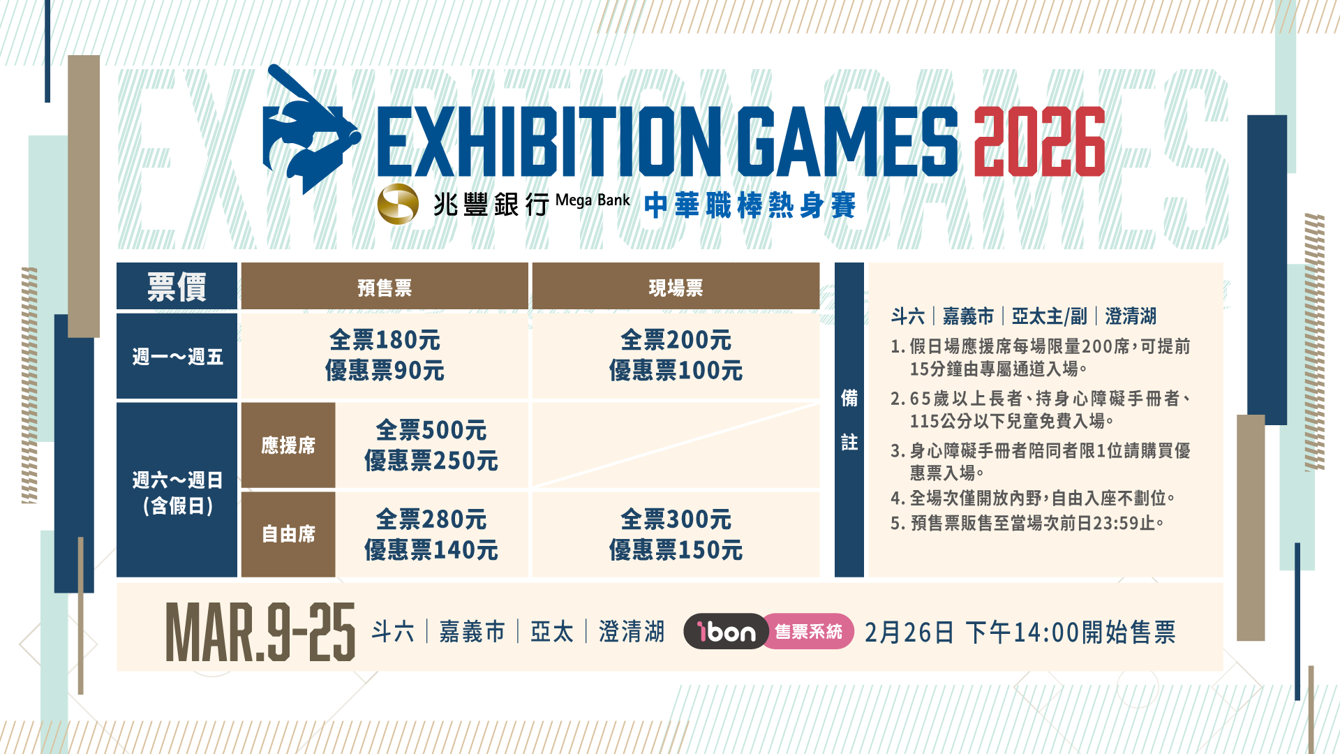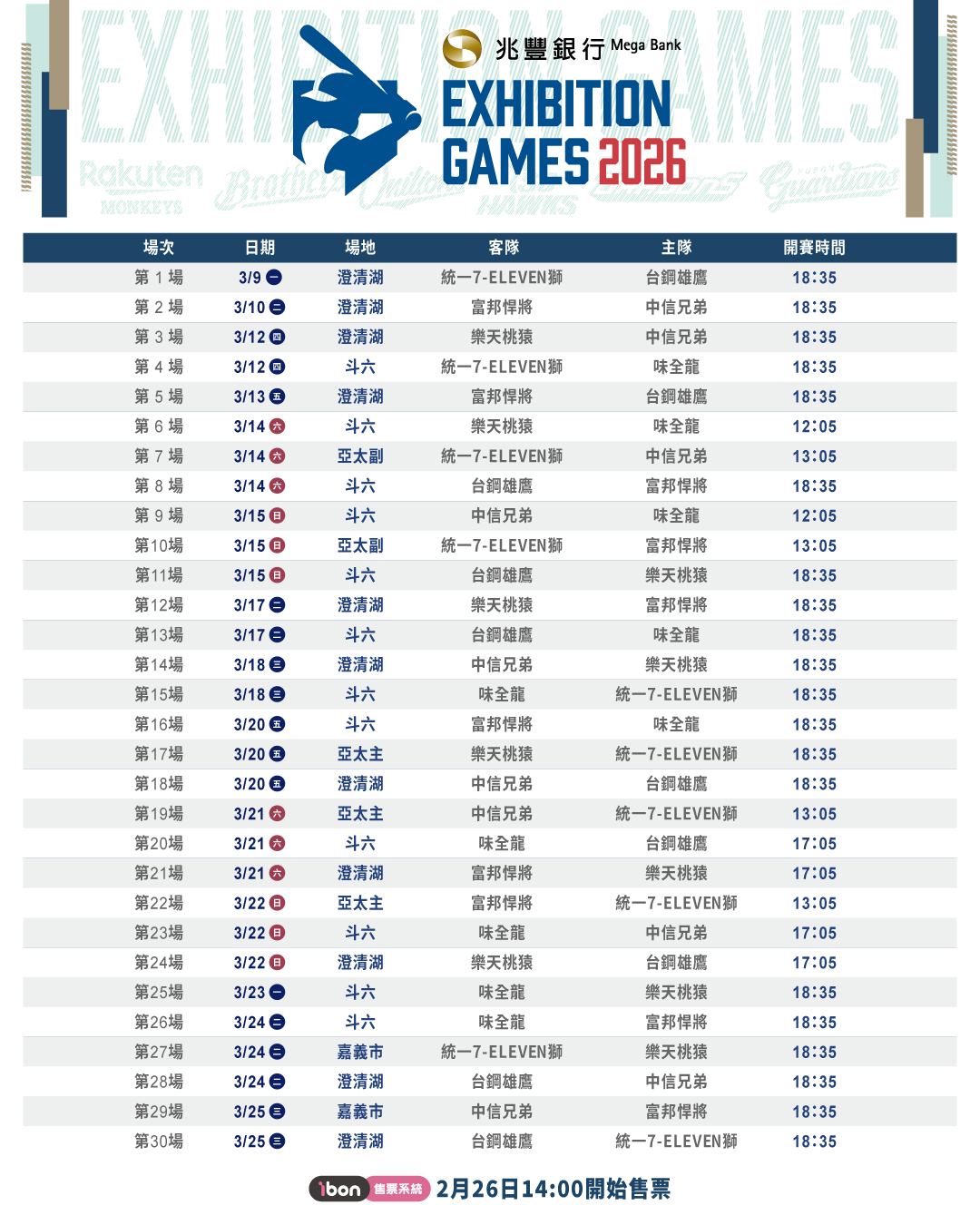 熱身賽售票資訊同步公布,平日全票200元、預售票180元;假日應援席採單一票價,全票500元,享提前15分鐘由專屬通道自由入座,每場次200張;假日自由席全票300元、預售票280元,皆採自由入座。售票將在2月26日下午2點於7-11統一超商門市機台或ibon售票網站開放購票,誠摯邀請球迷朋友踴躍進場觀賽,一同迎接嶄新球季的到來,也歡迎球迷透過緯來電視網、緯來OTT、愛爾達體育台、ELTA.tv欣賞熱身賽賽事。
