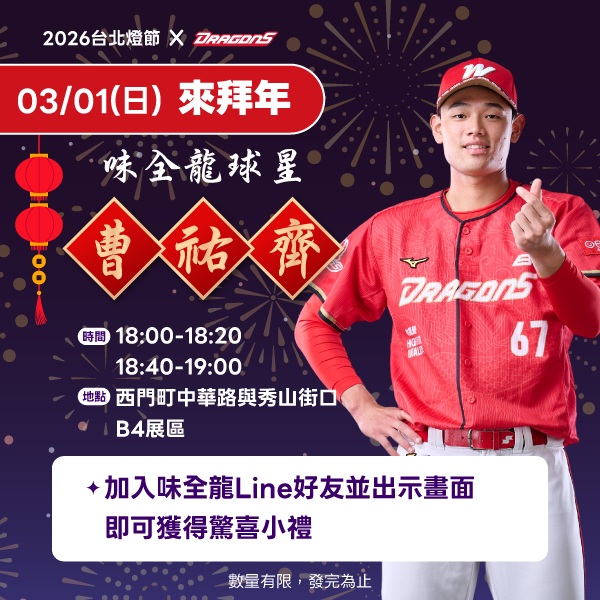 2026台北燈節即日起於台北西門町與花博園區璀璨登場。頂新和德文教基金會攜手味全龍打造《台北主場・奔龍而上》燈組,邀請棒球迷在光影中,走進屬於自己的主場時刻。3月1日晚間除將有球星曹祐齊現身與民眾互動,味全公司、德克士炸雞也將在現場發送限量贈品。