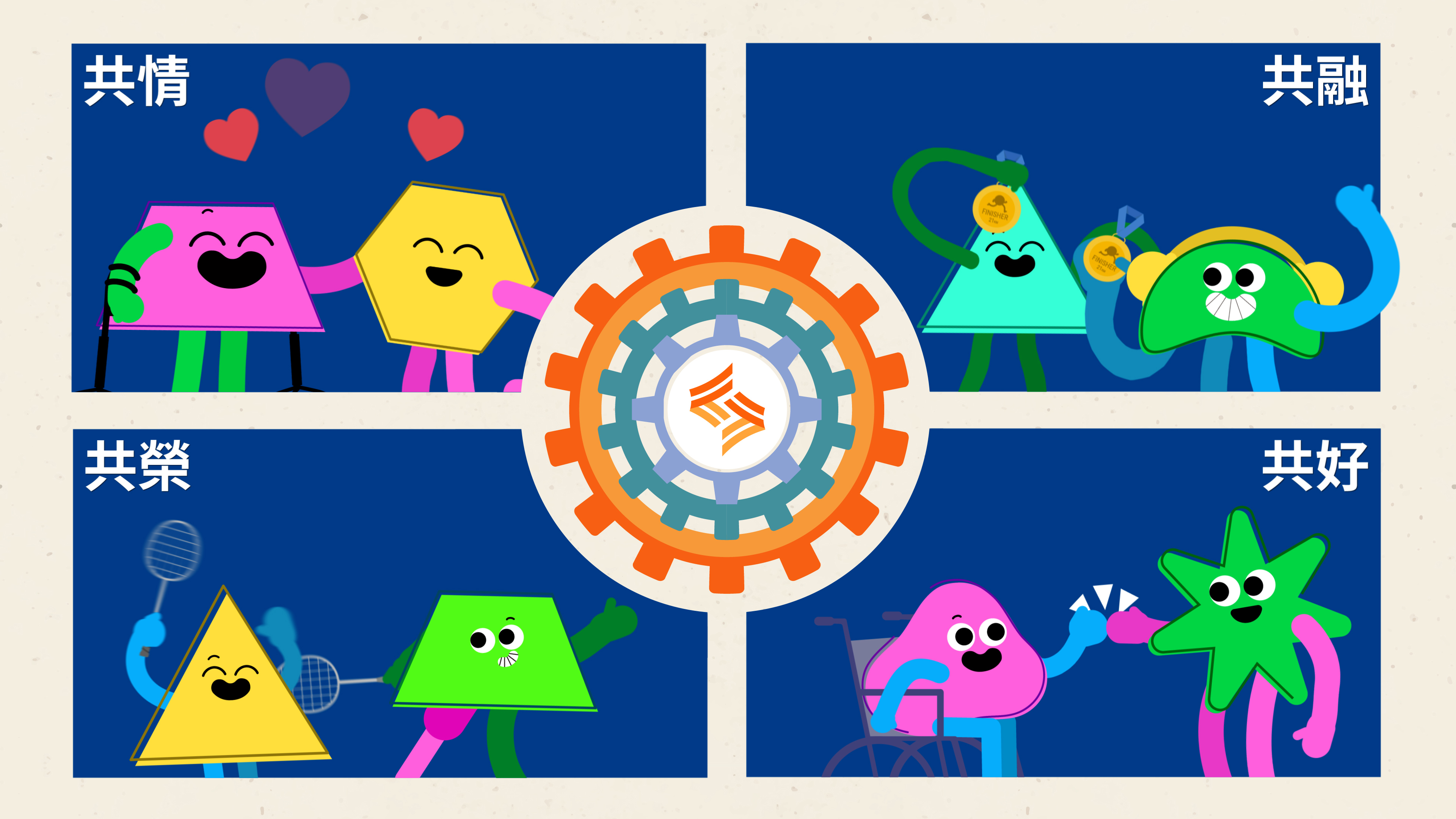 適應運動司宣導影片透過形狀、顏色與節奏感的變化,隱喻每個人皆有差異,但都能在同一個空間中共同參與、彼此協作,正符合運動部期待打造共融運動環境的理念。(中華民國運動部提供)