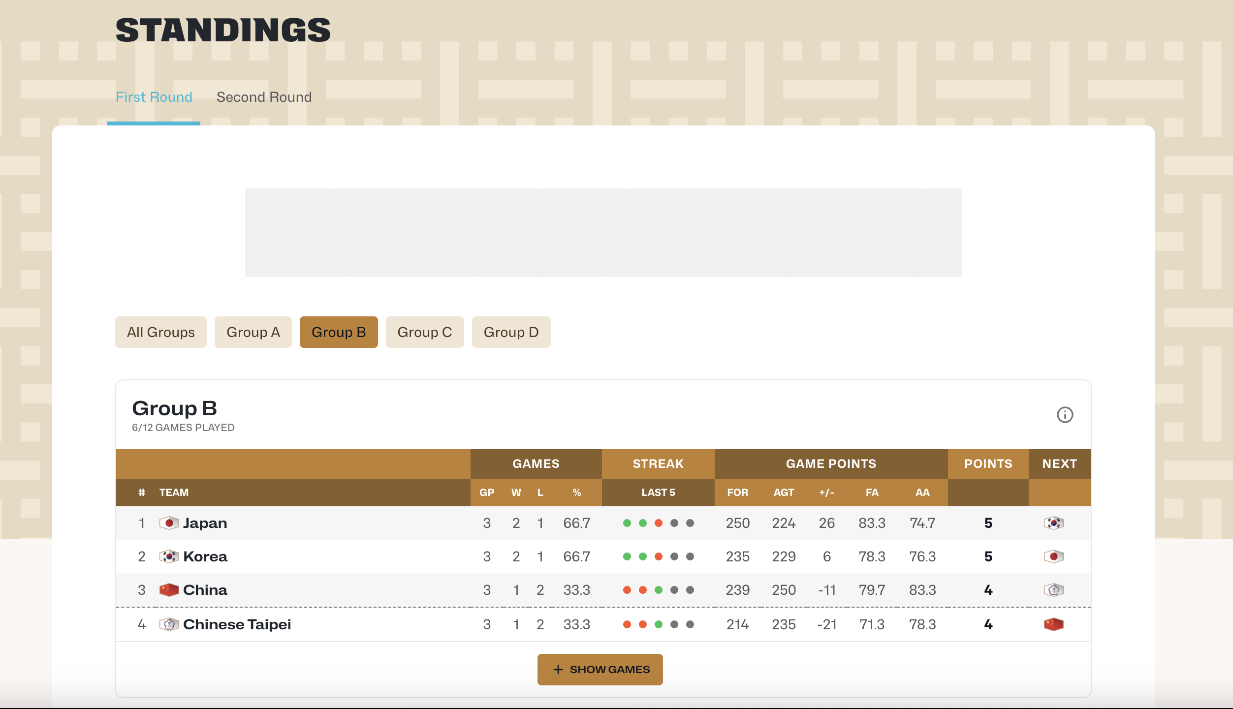 B組目前的形勢,第1的日本積分5分,勝負分差正26分;第2的韓國積分5分,勝負分差正6分;第3的中國積分4分,勝負分差負11分;第4的中華積分4分,勝負分差負21分。