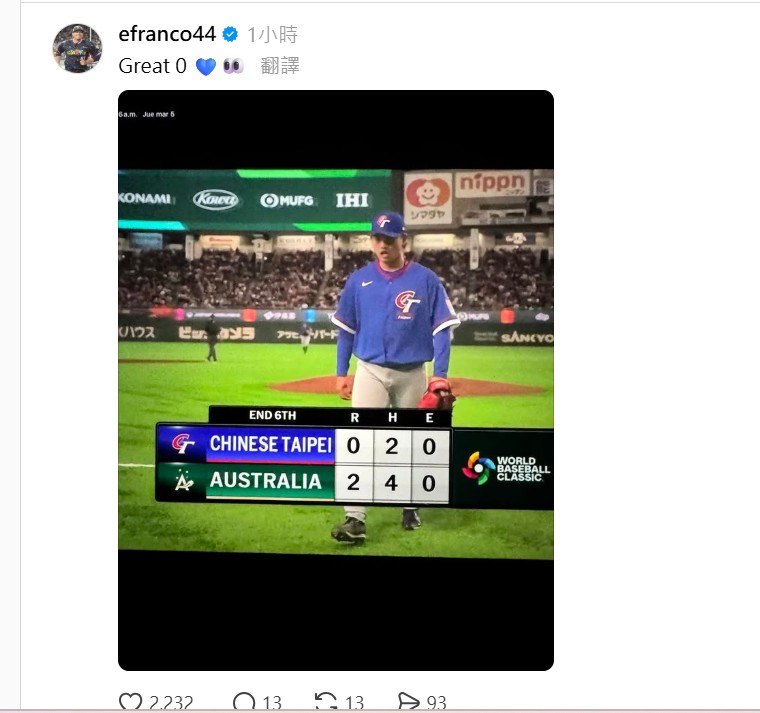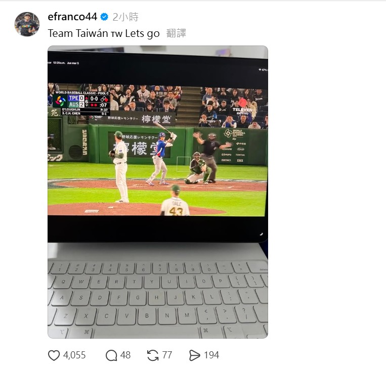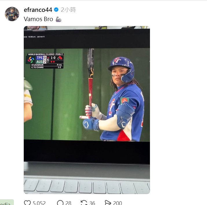 2026年世界棒球經典賽今天在東京巨蛋展開全球首戰,中華隊迎戰澳洲,雖然最終以0:3吞下敗仗。不過在場外,有一位熟悉的身影默默替台灣加油,曾效力富邦悍將4季的火球洋投富藍戈(Enderson Franco)。他透過社群平台全程關注比賽,連發4篇動態為中華隊助威,並特別截圖老隊友張育成、張奕的場上畫面,可說是力挺到底。
