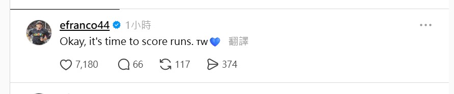 比賽進行過程中,富藍戈也持續關注場上狀況。四局上張育成敲出中華隊首安時,他立即分享畫面替好友喝采;六局下張奕登板化解滿壘危機時,他也再度轉發相關片段,為昔日並肩作戰的隊友加油。