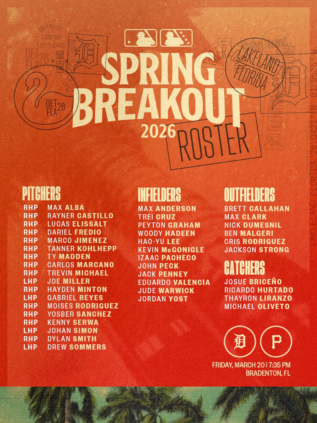 底特律老虎公布2026年春訓新秀對抗賽名單,李灝宇名列內野手之中。(取自底特律老虎 X)