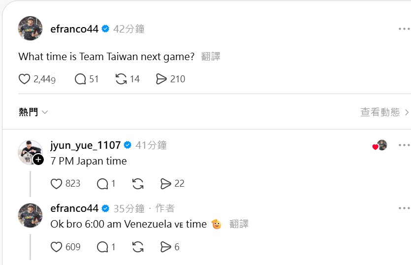 富藍戈詢問中華隊比賽時間。(截圖自富藍戈thread)