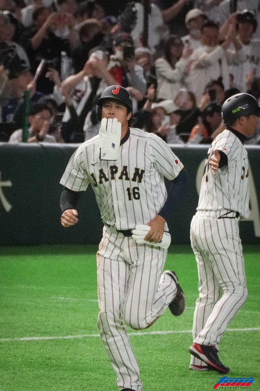 3局上第2個打席,大谷翔平面對高永表73.9英里(約118.9公里)曲球,一棒掃出全壘打,WBC前兩場比賽都開砲。1出局後又是曲球,鈴木誠也再度擊出全壘打。