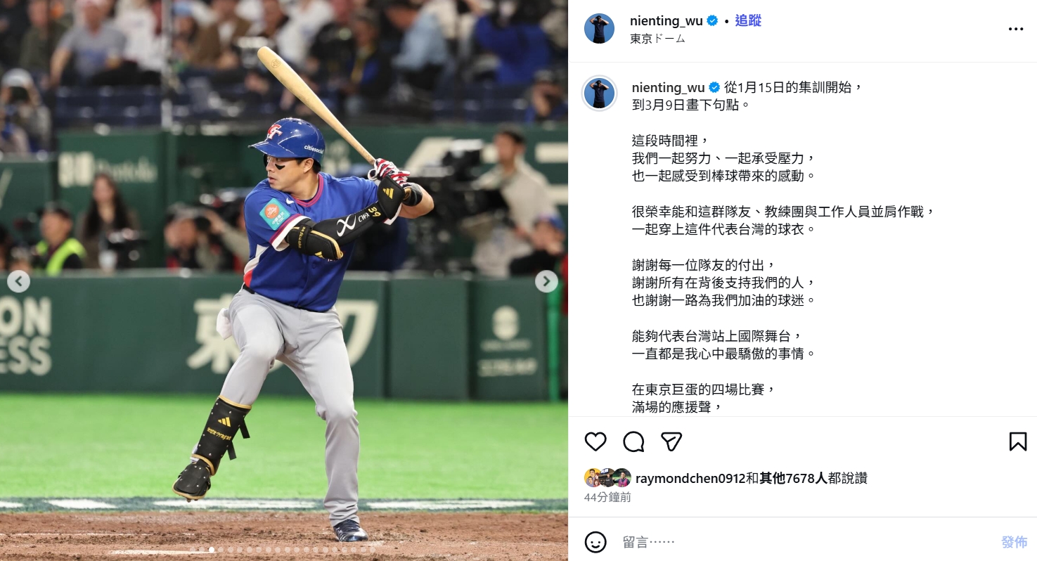 中華隊結束在本屆世界棒球經典賽WBC的旅程,10日要飛回台灣,球隊也將解散,吳念庭在IG發文,「能夠代表台灣站上國際舞台,一直都是我心中最驕傲的事情。」