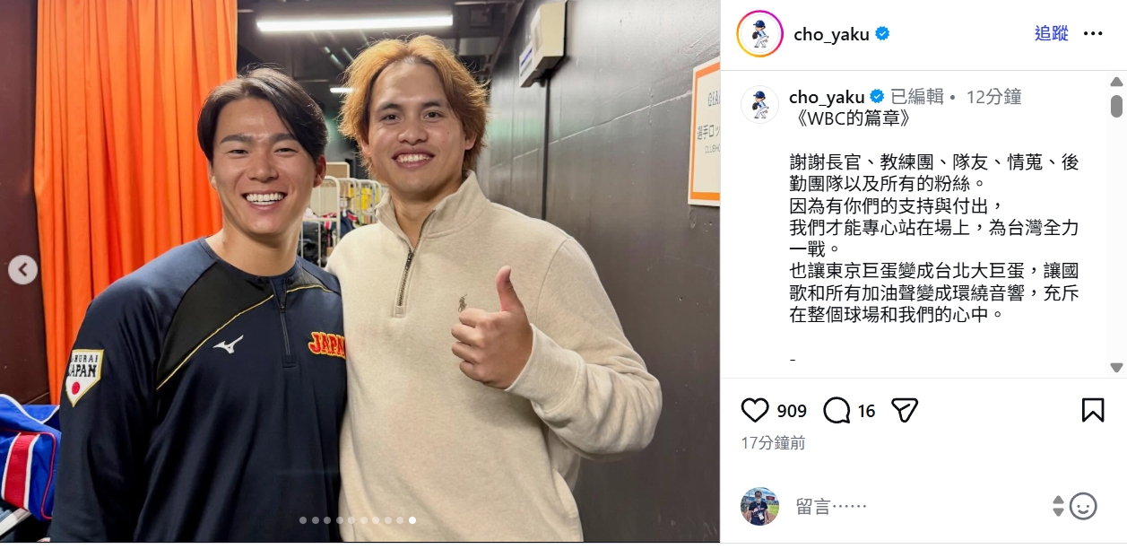他在社群平台發文《WBC的篇章》,放上中華隊全體合照、台韓戰九局下投球影片、富邦悍將球員合照、投球照片、中華隊賽後在巴士內的合照,以及與前日本隊友的合照,最後一張則是與山本由伸的合照。