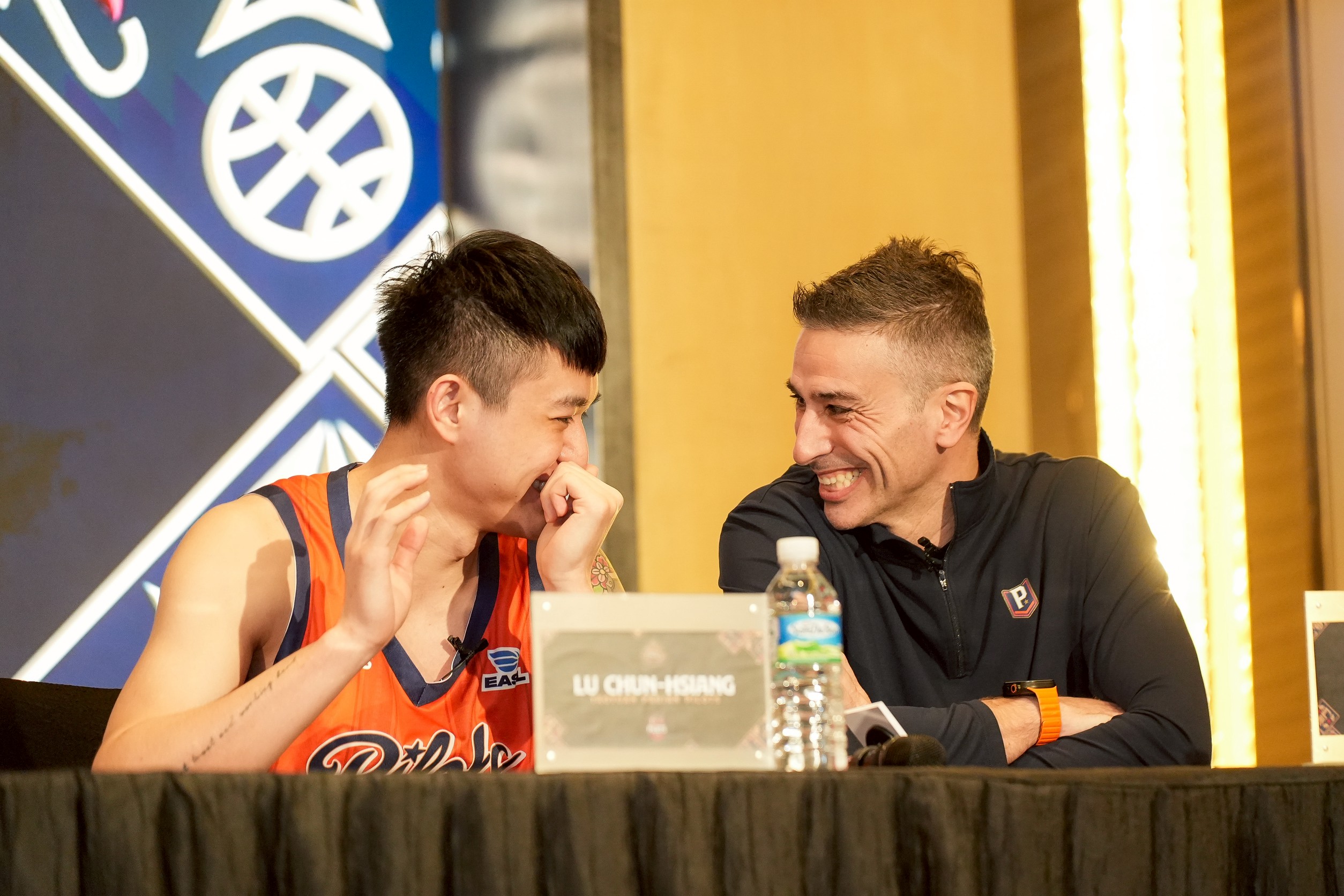 今天記者會過程有有趣插曲,盧峻翔與卡總不斷交談,並不時燦笑,他透露當下情況,「主要是等下要講英文,我英文不太好。」卡米諾斯補槍說,「沒有翻譯讓他很緊張。」盧峻翔回憶,與去年記者會相比,上次他是第一個發言,沒有翻譯,林書豪還想教他講比賽感受,他則覺得「你說的真的假的,是滿有趣的事情」。