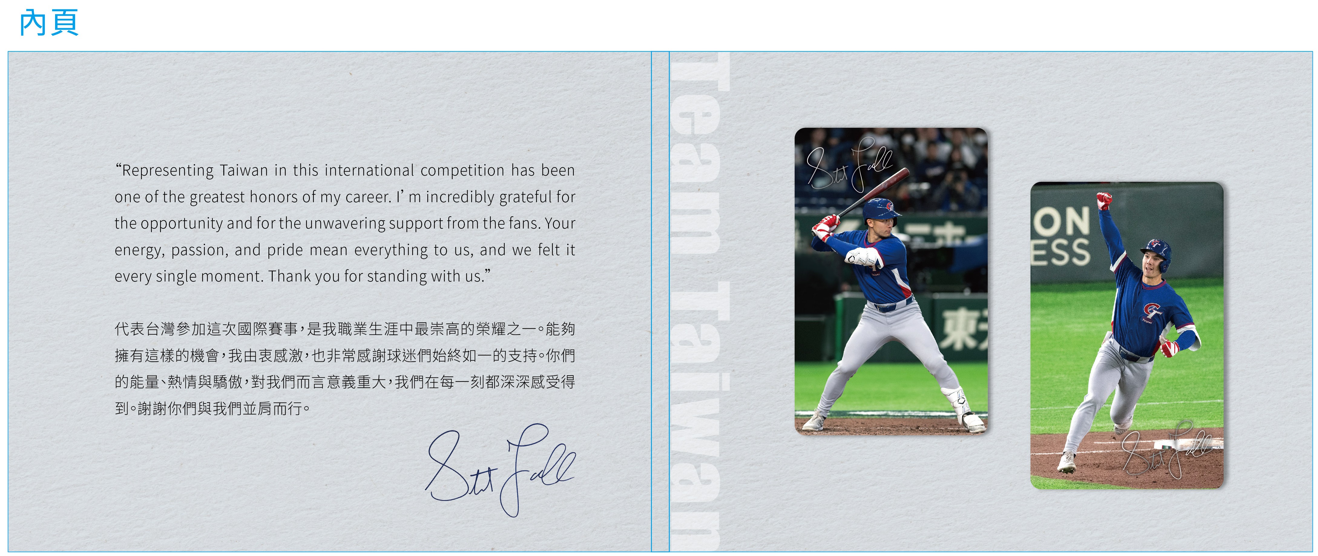 為紀念這場振奮人心的國際賽事與費仔的關鍵表現,悠遊卡公司特別推出「Stuart Fairchild費仔榮耀致勝SuperCard紀念悠遊卡」,本系列以費仔在比賽中的高光時刻為設計主軸,並搭配費仔的簽名燙印,發行一套2張悠遊卡,卡面完整呈現費仔打擊瞬間與球場張力,卡套封面設計更具深意,捕捉費仔揮出全壘打、奔回本壘時綻放笑容的瞬間,彷彿感受到全場沸騰的歡呼與勝利的喜悅,結合TEAM TAIWAN字樣,將比賽的熱血與榮耀濃縮其中,極具收藏價值。透過此次紀念商品的推出,期盼延續賽事帶來的熱血與感動,讓這段屬於Team Taiwan的重要時刻,留存在每位球迷心中。
