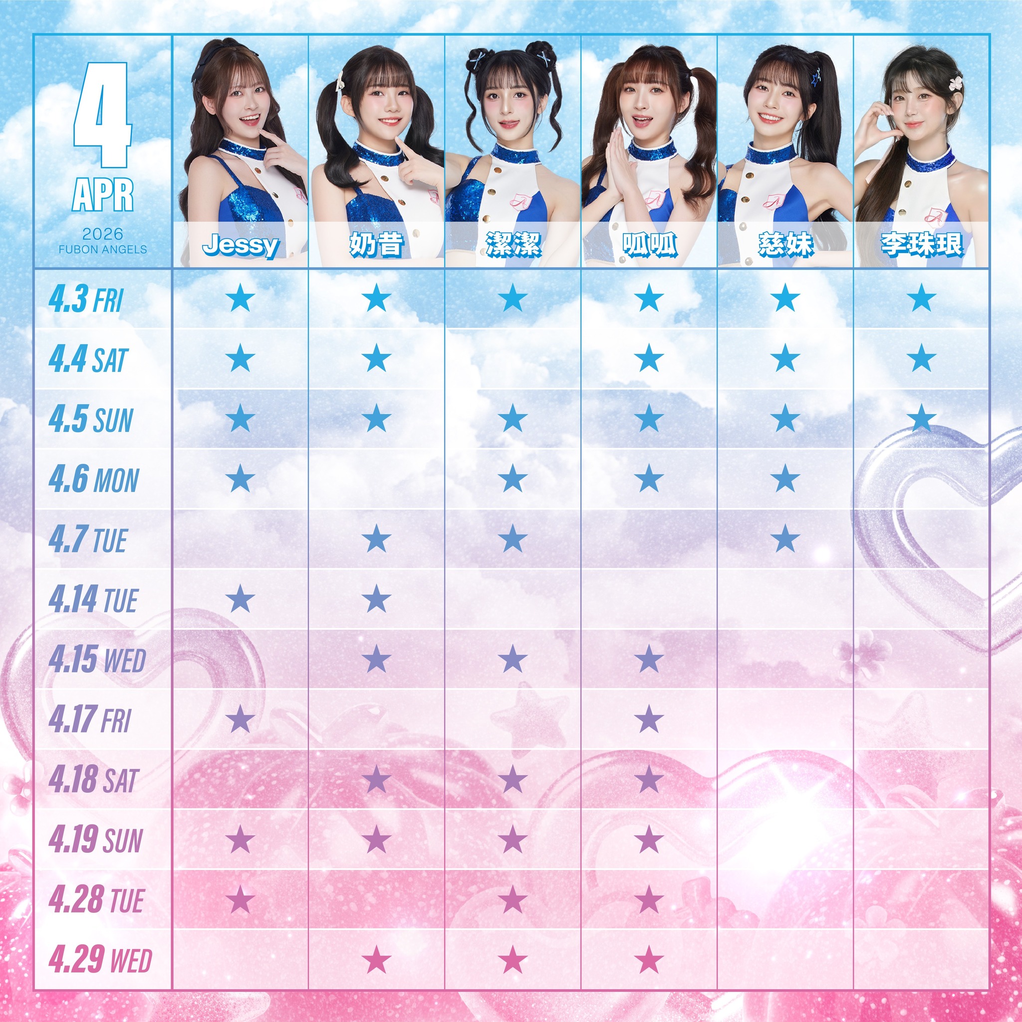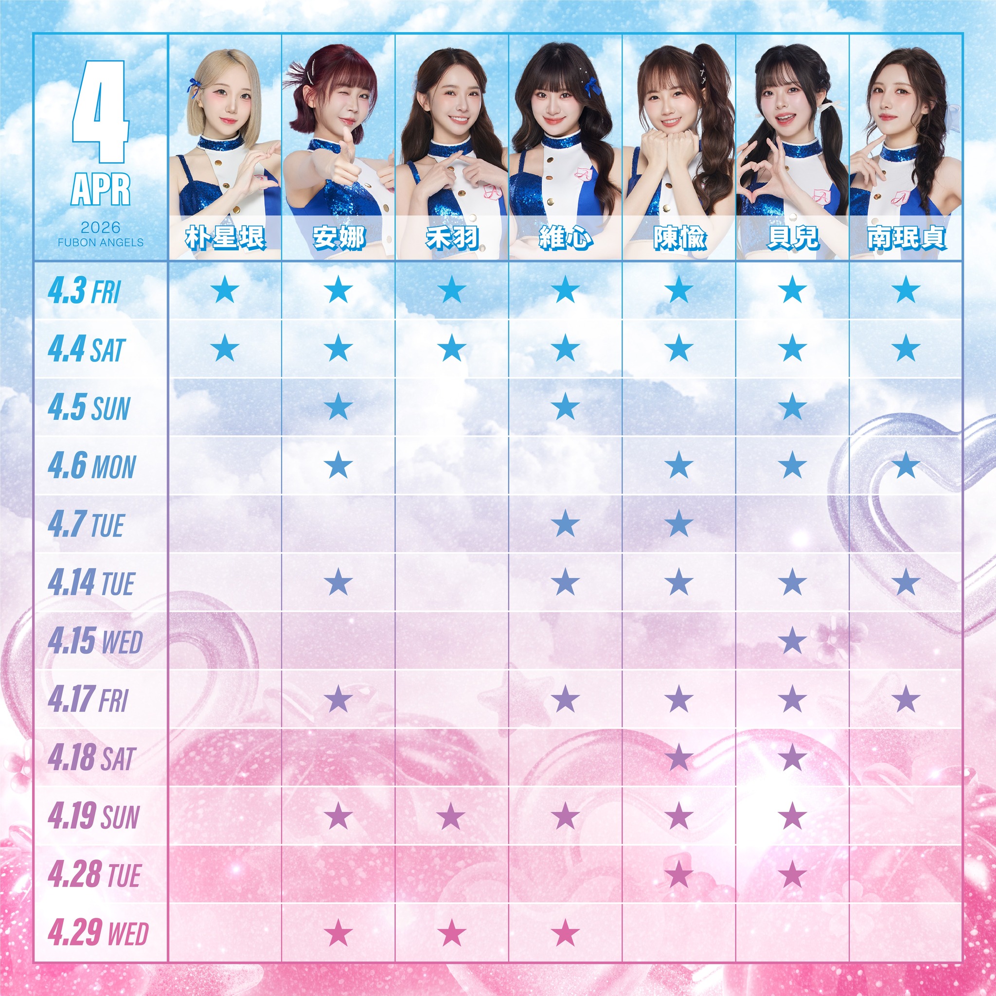 Fubon Angels富邦悍將啦啦隊4月班表出爐,韓援五本柱在4月3日、4日在新莊球場合體,李珠珢只有4月3日到5日在新莊球場開幕3連戰應援。