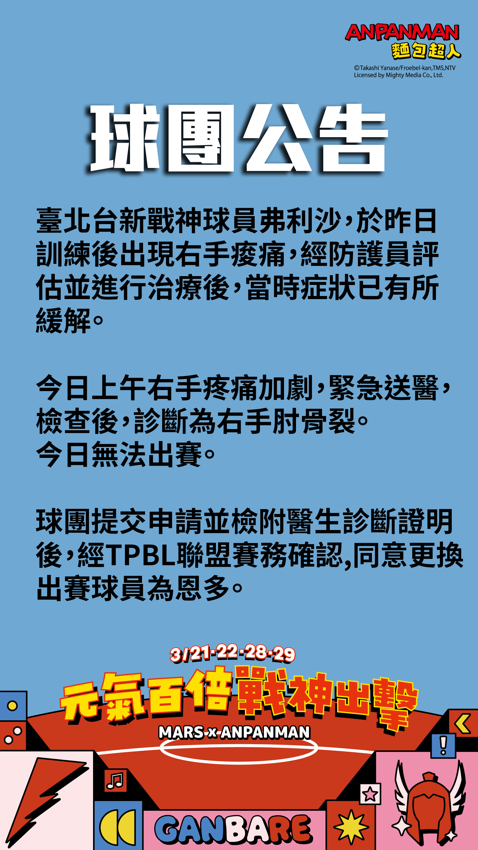 對此,台新戰神球團也說明事件經過。球團表示,弗利沙於昨日訓練後出現右手痠痛,經防護員評估並接受治療後,當下症狀一度緩解。然而今日上午疼痛情況加劇,隨即緊急送醫檢查,最終診斷為右手肘骨裂,確定無法出戰今晚比賽。