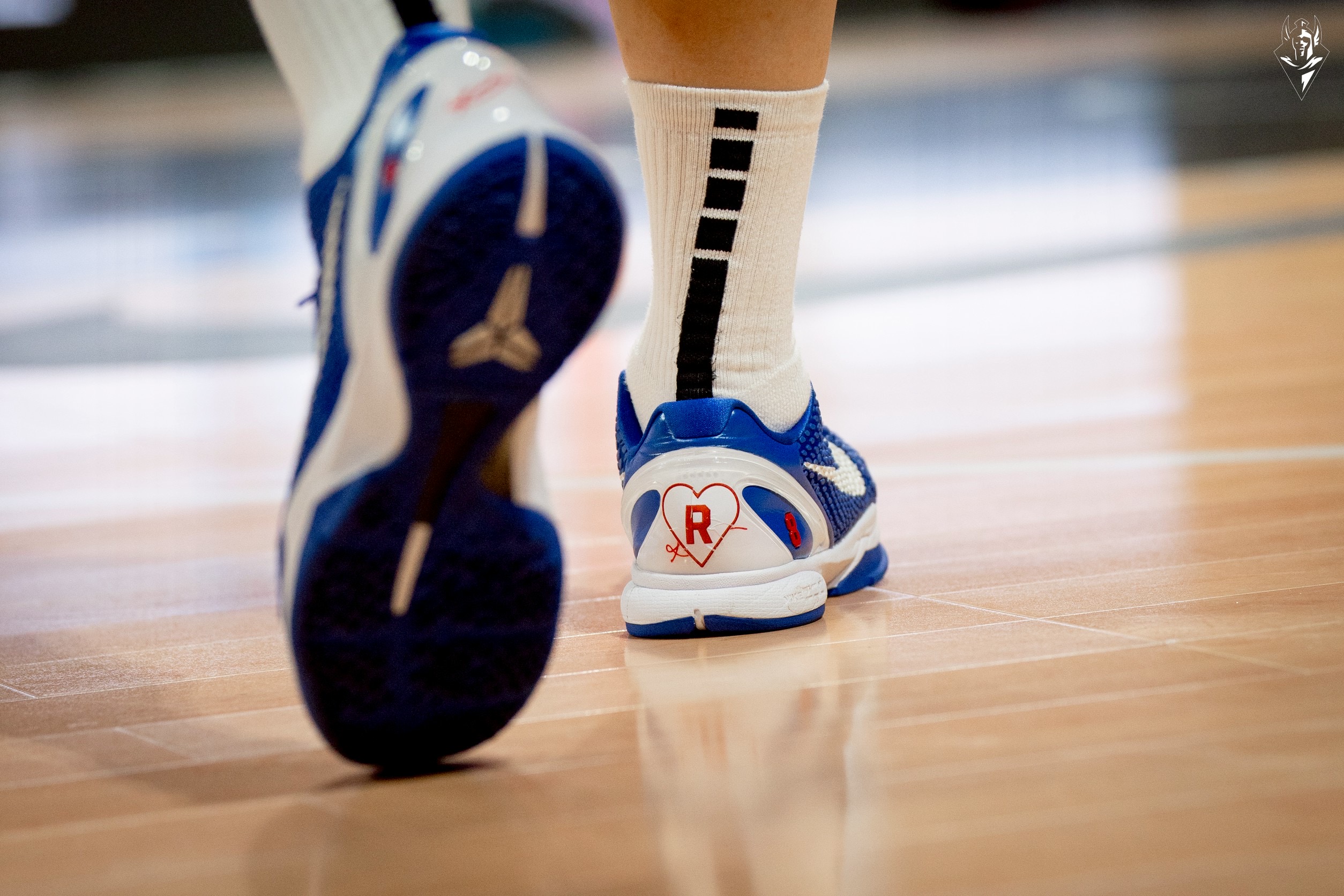 球員於球鞋上貼有其英文名字Riley首字母「R」的貼紙,紀念這位曾與大家並肩努力的夥伴。(戰神提供)