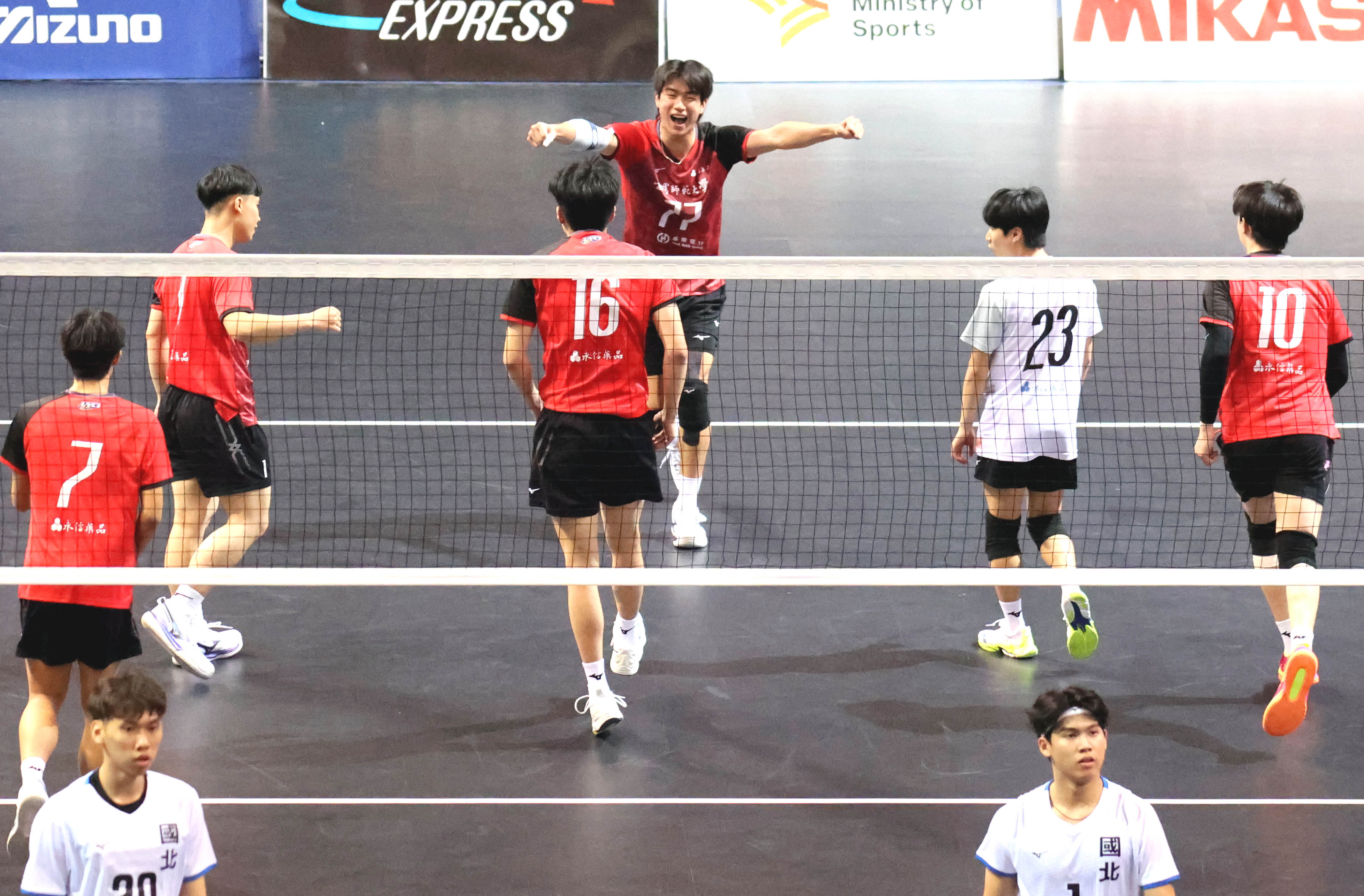 温逸凱(77號)與隊友慶祝勝利。(中華民國大專院校體育總會提供)
