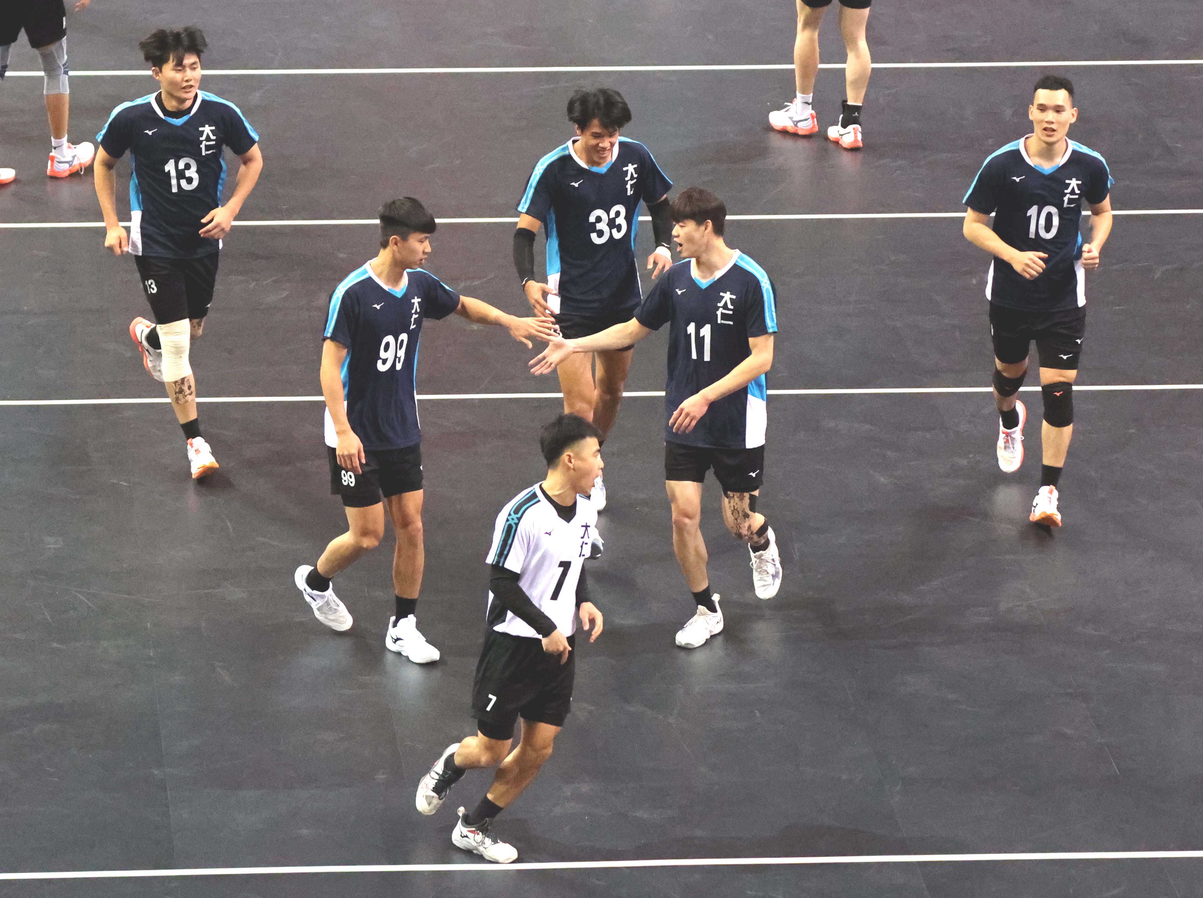 大仁科技大學慶祝得分,左起張智盛、鄭偉志、林志釧、陳裕仁、曾茂聰,前方白衣為自由球員李瑋軒。(中華民國大專院校體育總會提供)