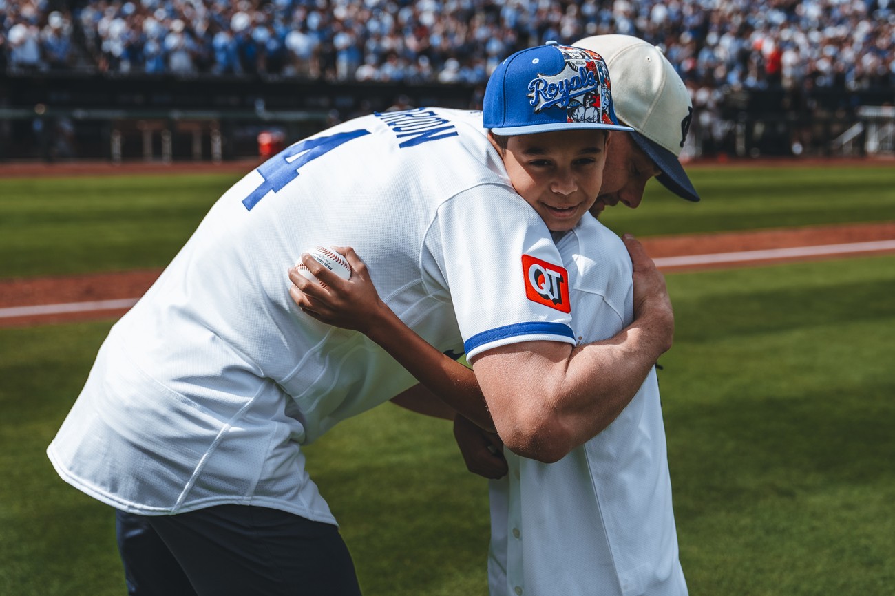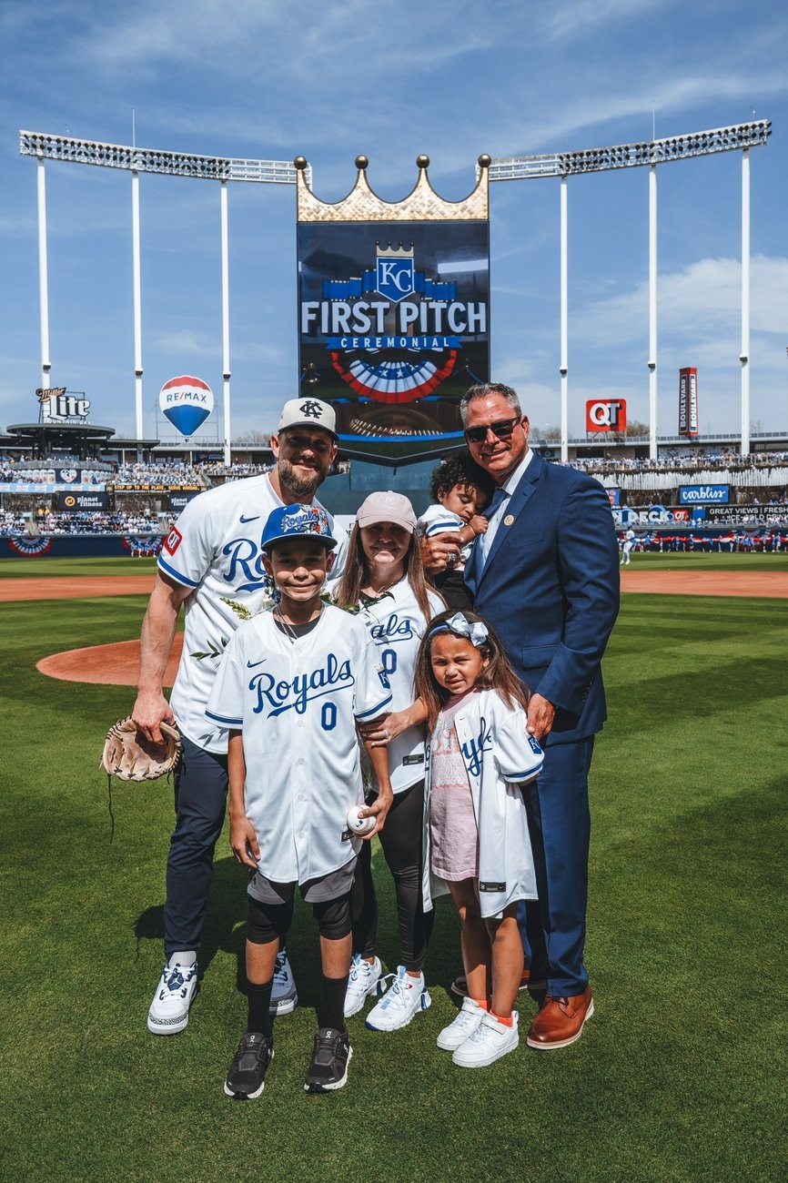 隨後,眾人將目光轉向場上,由長子 Zane 擔任開球嘉賓,將球精準投向皇家名人堂球星 Alex Gordon。當球穩穩進入手套瞬間,全場爆出如同當年Gore在壘間奔馳時的歡呼聲,向這位曾帶來無數速度與激情的球員致敬。