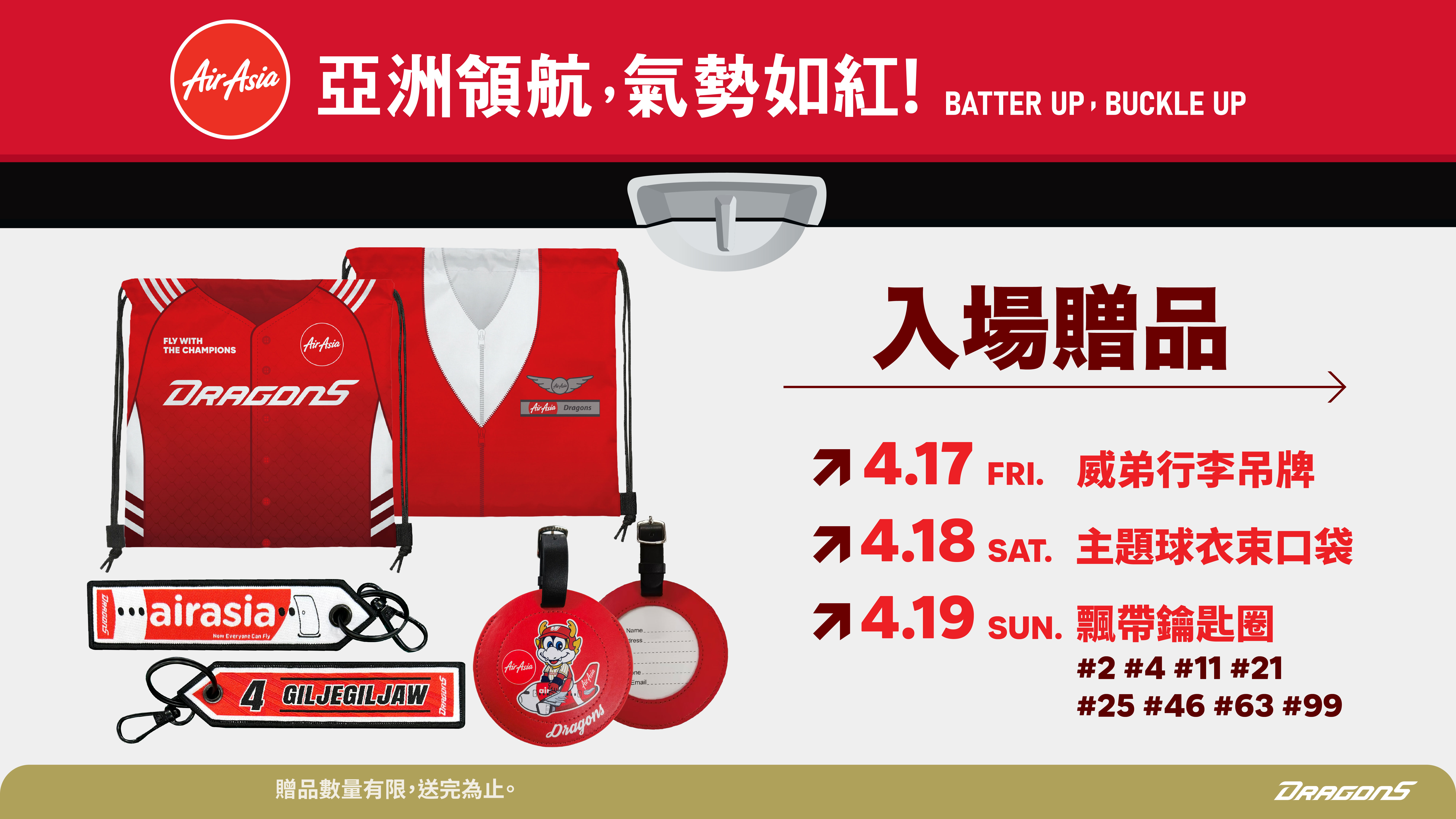 活動期間,球場將化身航空場景,入口處特別打造 AirAsia 特色登機門,讓球迷彷彿準備登機起飛;主題日三天將分別發送限量的威弟行李吊牌、AirAsia聯名主題日束口袋以及飛行飄帶鑰匙圈給進場球迷,入場即可獲得,數量有限,送完為止。