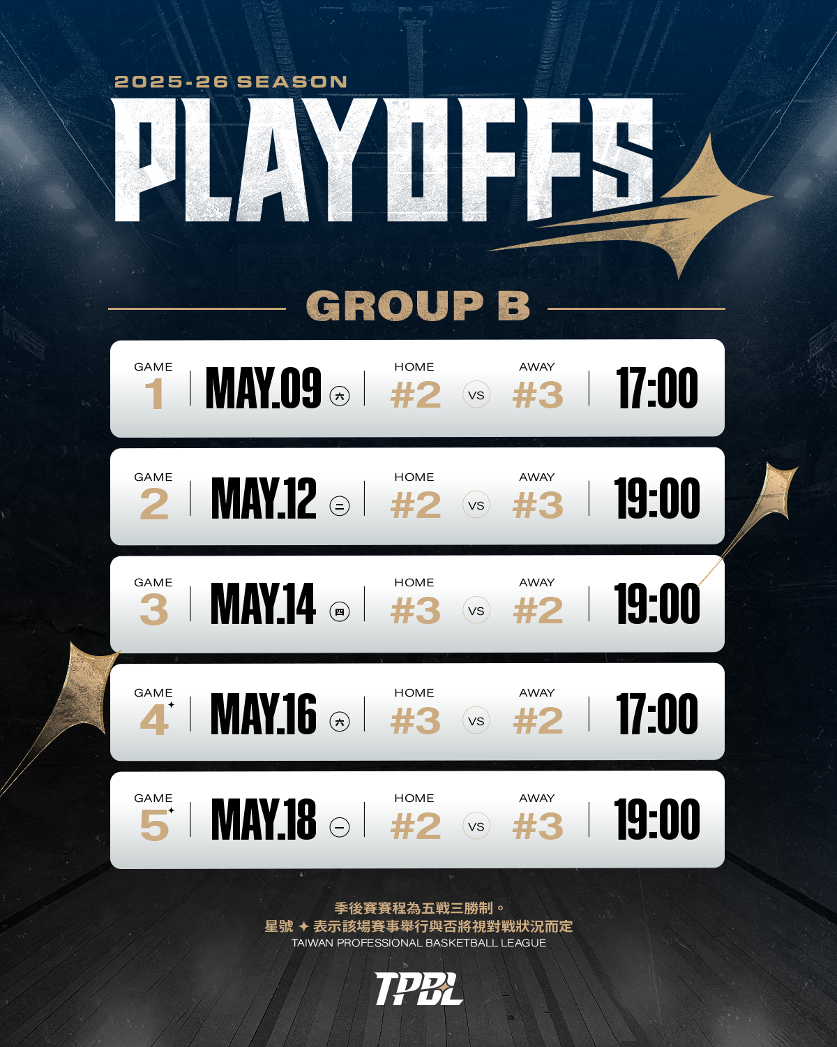 TPBL例行賽進入最後倒數,聯盟今天(24日)公布季後賽相關時程,季後挑戰賽將於5月5日率先登場,季後賽首輪則緊接在5月9日點燃戰火。