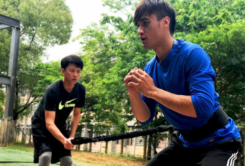 森榮鴻在國立體大自主訓練,左一為訓練師林衛宣。(由MyVoice提供,耿子元/攝)