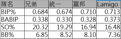 從上表就可以發現,統一打者群和Lamigo打者群比較,除了兩好零壞的狀況以外,Lamigo的打者是會更積極出棒(BIP%較高),而且在積極出棒之後得到好結果(BABIP較高)。