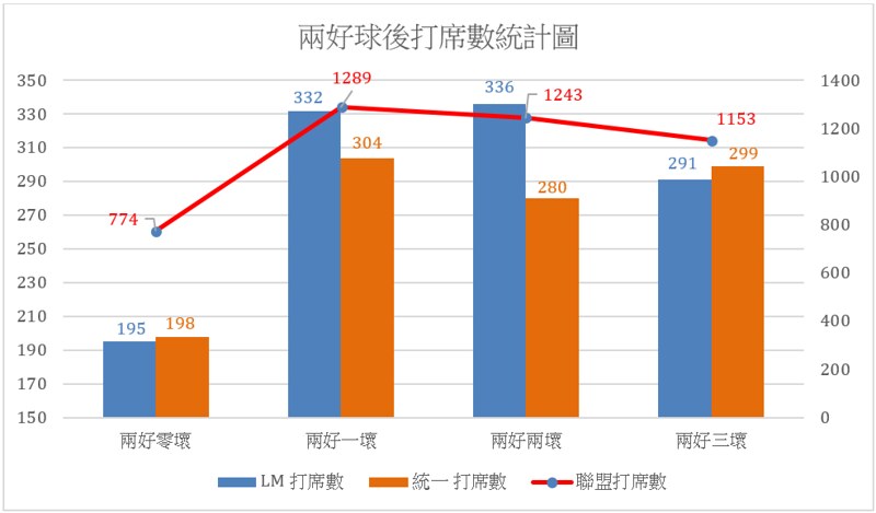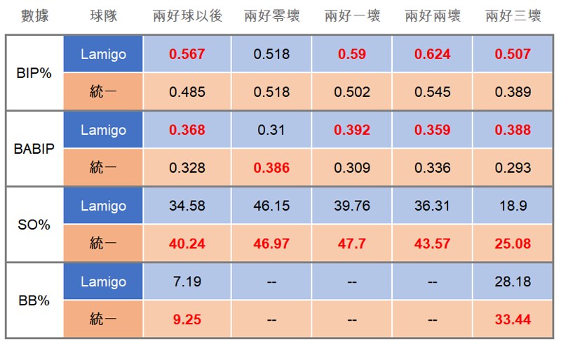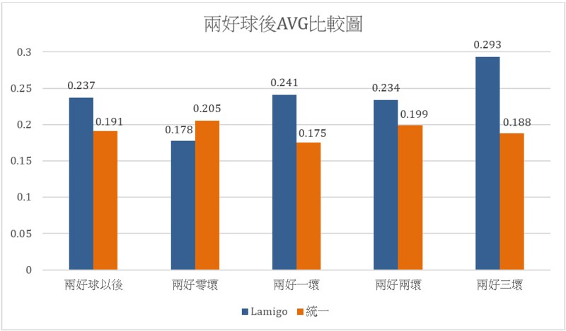 至此,我們也可以知道:這兩支球隊的兩好球對策可以說是不同的:Lamigo是積極出棒,統一則傾向選擇等待。