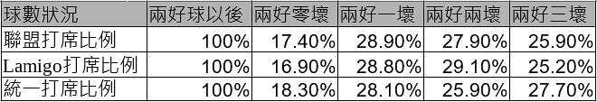 接著,Lamigo的打席原本就比較高,佔了總打席數的26.02%,統一則是最低的24.24%,在兩好球之後的打席,Lamigo打席佔了25.88%,統一則佔了24.24%,和總打席的比例差不多。