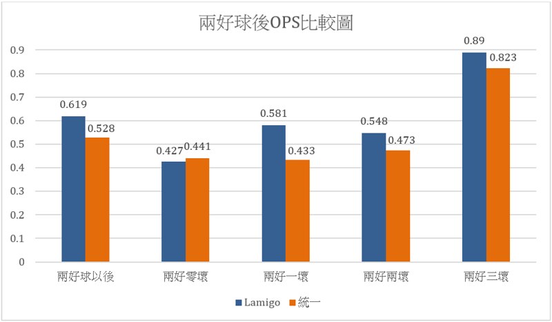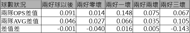 如上可見,在兩好球以後,除了兩好零壞的狀況以外統一都輸給Lamigo,在兩好一壞和兩好兩壞差距相當明顯,分別差了34%與16%,而兩好零壞兩邊OPS的差距僅有3%,不能說有顯著差距。