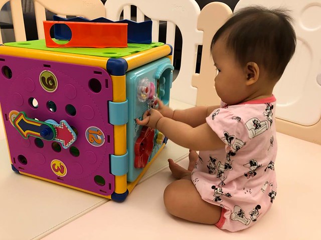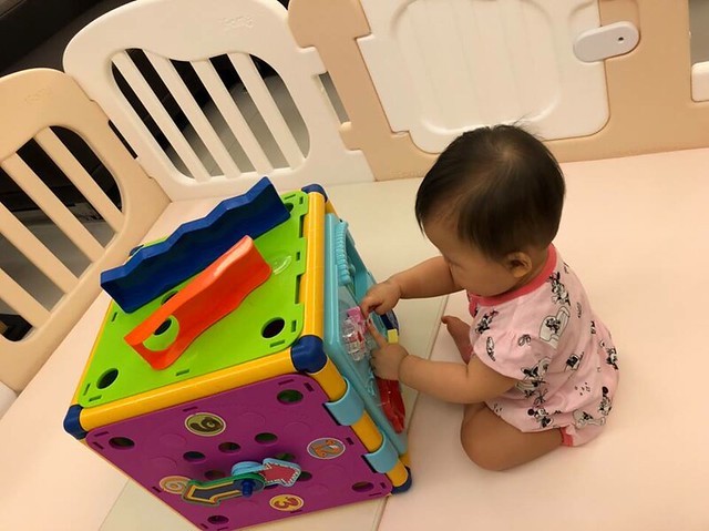 江宏傑透露,最近小小愛會坐在玩具區非常專心地自己研究玩具箱,「她也會試圖去扶著動動腦力體力玩具箱的邊緣站著,看到上方不一樣的玩法又燃起興趣,反應很可愛。」