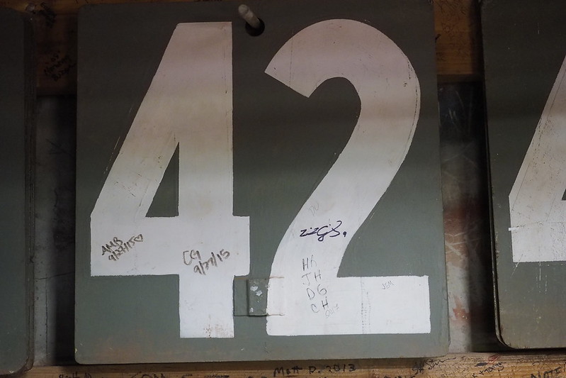 除了球員簽名,滿牆塗鴉背後,常蘊藏著深刻的歷史意涵。其中牆上一排X符號,便是名人堂球員Ted Williams在1951年當時的全壘打記錄。而在一堆數字鐵板中,竟仍可以找到早已退休的42號。工作人員向我解釋:「這號碼還留著,因為每年Jackie Robinson紀念日時需要用到。」並開玩笑說,說不定有哪場球賽比數也可能用得到。