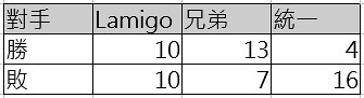 如上表,簡單來說就是打上半季王者Lamigo富邦也能還殺的勝負難分,打中信兄弟也能得到極大優勢,然後,對統一就……就場場慘劇。