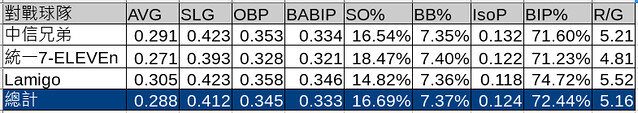 從這種種面向來看,我們可以說:富邦的球員碰到統一其實沒有比較不會選球,也沒有比較愛亂揮,對打擊率真正造成影響的,是把球打進場內以後,球因為各種原因直接去找手套。把上半季富邦對其他球隊的打擊一併列出,會顯得更清楚: