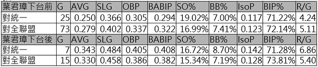 ……講到這裡,我想大家應該都發現到富邦對統一的BABIP從落差極大的.248爬回.321,代表在三個月內BABIP必有極大爬升,難道陣前換將真的有魔法,葉君璋一從總教練的座位上挪開,富邦打線就自動復活?