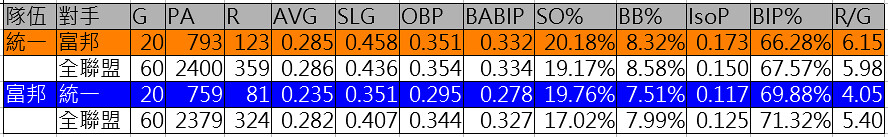 如果我們把上半季富邦和統一雙方對戰打擊成績拿出來看,會得到這樣的數字:
